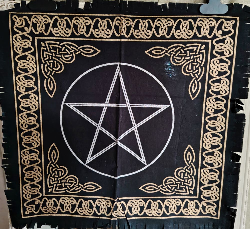 Kaunis alttariliina, jossa on keskellä hopeisena pentagram. Ympärillä oleva kehys ja koristeet kulmissa on painettu kultavärillä. Pohjaväri on musta.