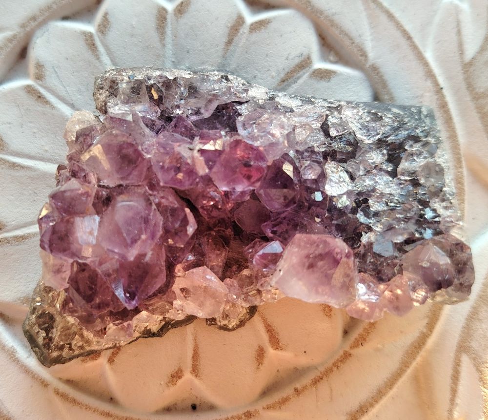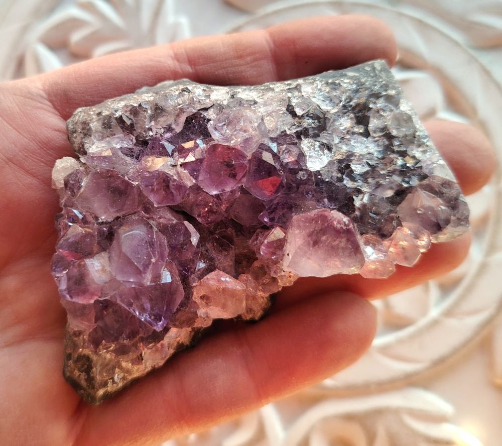 Kaunis ametistiklusteri. Saat itsellesi kuvassa näkyvän kiven. Koko: 7 cm x 5 cm (korkeus 1,5-2 cm), paino 98g