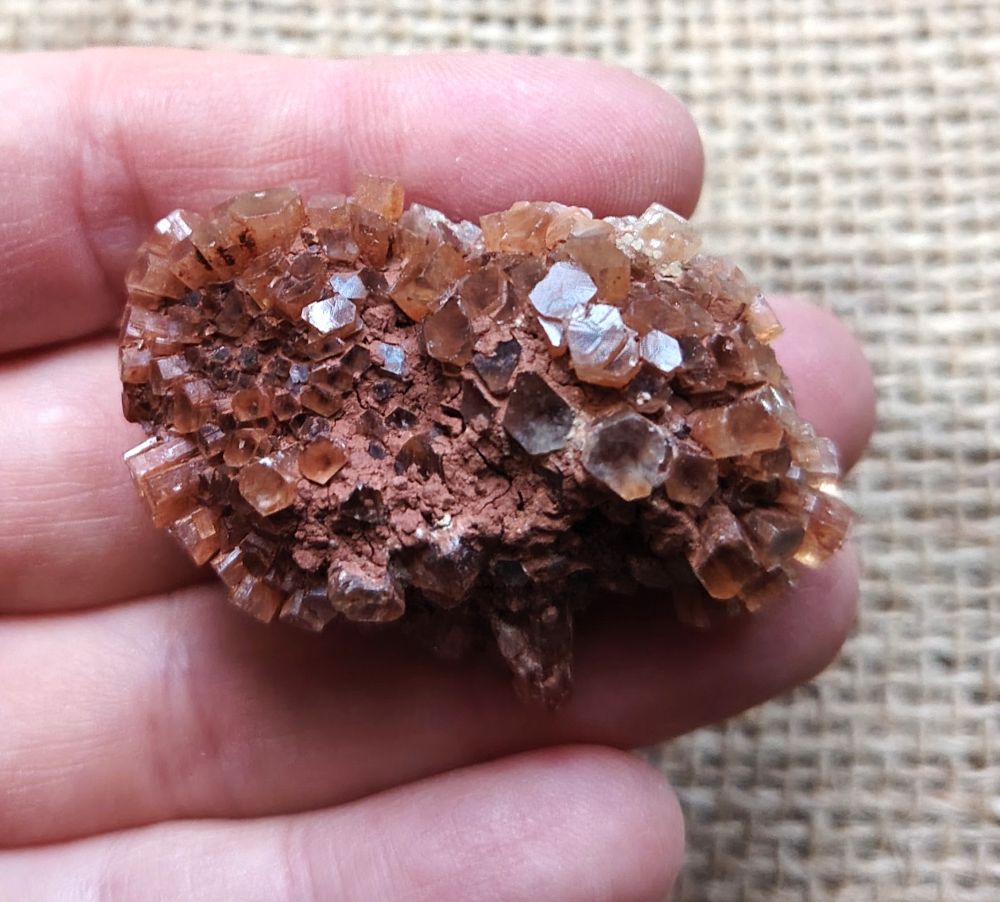 Saat itsellesi kuvassa näkyvän kiviklusterin. Klusterin koko on 3 x 5 cm. Tässä yksilössä on myös valkoista aragoniittia eli tämä on jännä väriyhdistelmä punaista ja valkoista.