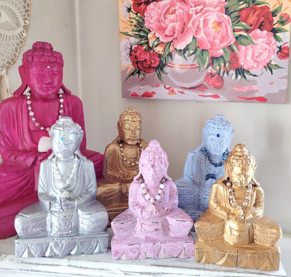 Magneta Buddha yhdistetään myötätuntoon, hoivaamiseen ja emotionaaliseen tasapainoon. Magneta edustaa 8. chakraa (soul star), joka edustaa matkaa elämän todellisen tarkoituksen löytämiseksi fyysisen kehon ulkopuolelta. Väriterapiassa magentaa käytetään edistämään henkistä paranemista, luovuutta ja kykyä löytää tasapaino kaoottisessa elämässä. Tässä Buddhassa on jotenkin niin feminiininen energia, joten nimeksi muodostui sen vuoksi Divine Feminine. Buddha on veistetty käsin pienessä perheyrityksessä Balilla ja viimeistely on by Shamaanitar. Jokaisen Buddhan ilme on hieman erilainen, joten toista samanlaista ei tule vastaan.