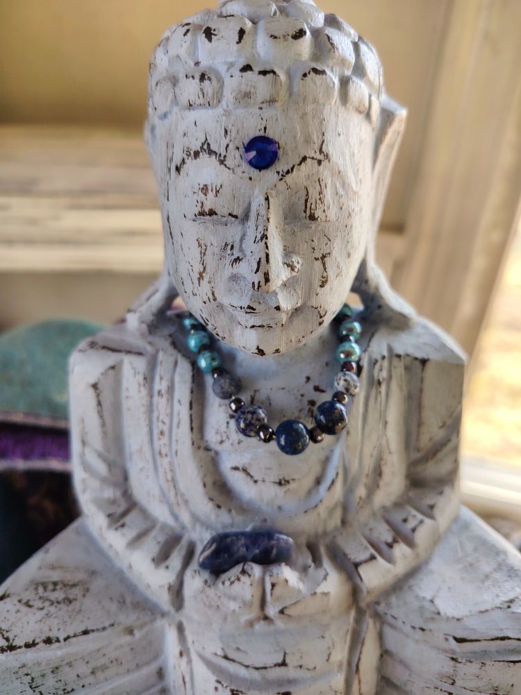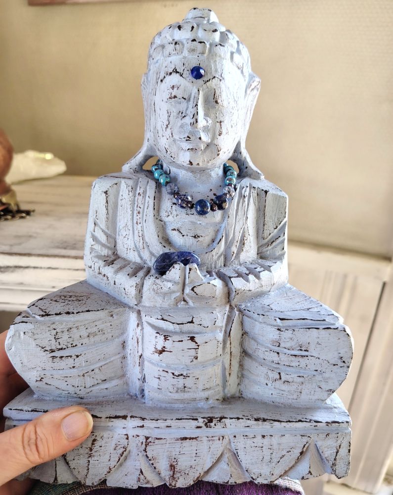 Tämä uniikki buddha sai vaaleansinisen sävyn itselleen ja kaulaan tein pienen malan, jossa on sodaliittia ja sinisiä posliinihelmiä. Buddhan pinta on rustiikkinen. Kolmatta silmää symboloi tummansininen "timantti" ja kädessä tällä on sodaliittikivi, joka tulee tuotteen mukana. Kivi on irtonainen, mutta pikku malaa ei saa irrotettua.