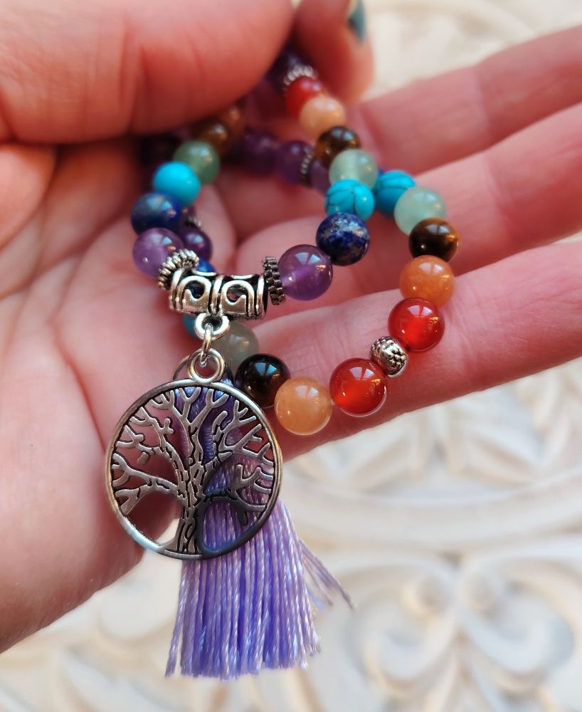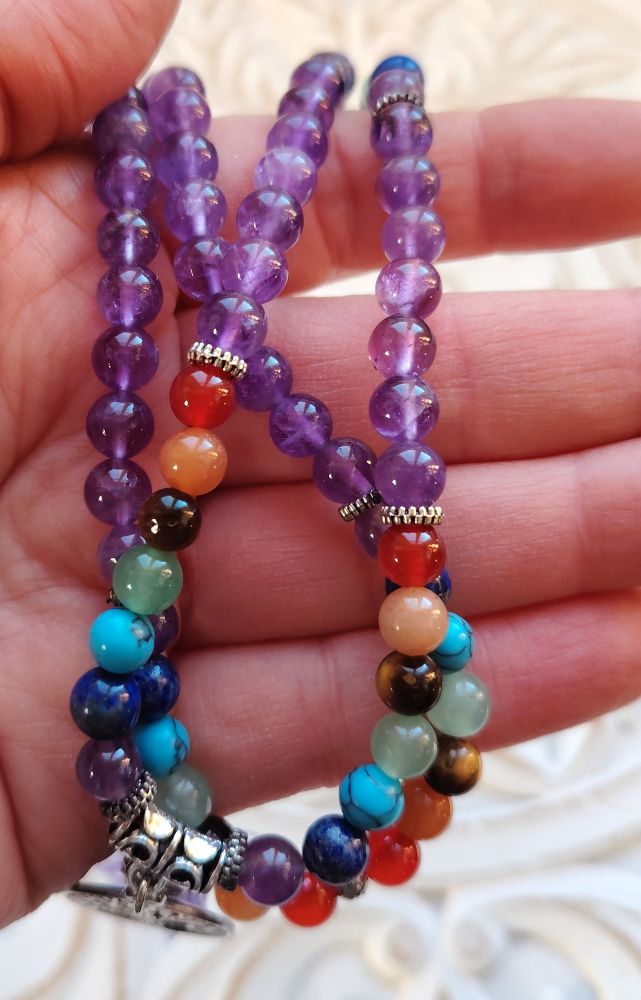Kaunis mala, jossa on kivenä ametisti ja lisäksi välissä on joka chakran kivet. 7 chakran kivet ovat Jasper, kalsiitti, tiikerinsilmä, aventuriini, turkoosi, sodaliitti, ametisti. Malassa on kaunis elämänpuu symboli ja lila tupsu. Joustava nauha eli voit käyttää tätä joko kaulassa tai ranteessa. Malan koko pituus on 66cm, jos pidät kaulassa niin ylhäältä alas oleva mitta on 33cm + tupsu. Malassa on 108 helmeä ja niiden koko on 60 mm.