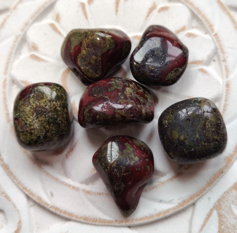 Dragonstone, jota kutsutaan myös Dragon's blood jasperiksi vaikka kivi ei kuulu jaspereihin. Kivessä on vihreää epidiottia, joka sisältää punaista piemontiittia. Rumpuhiottuja kiviä, kooltaan n. 2 - 3 cm. Saat itsellesi yhden kuvassa näkyvän kiven.