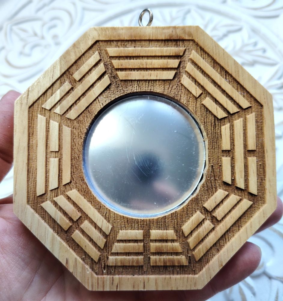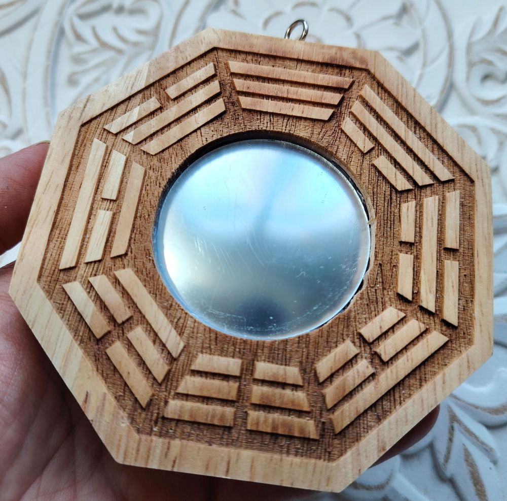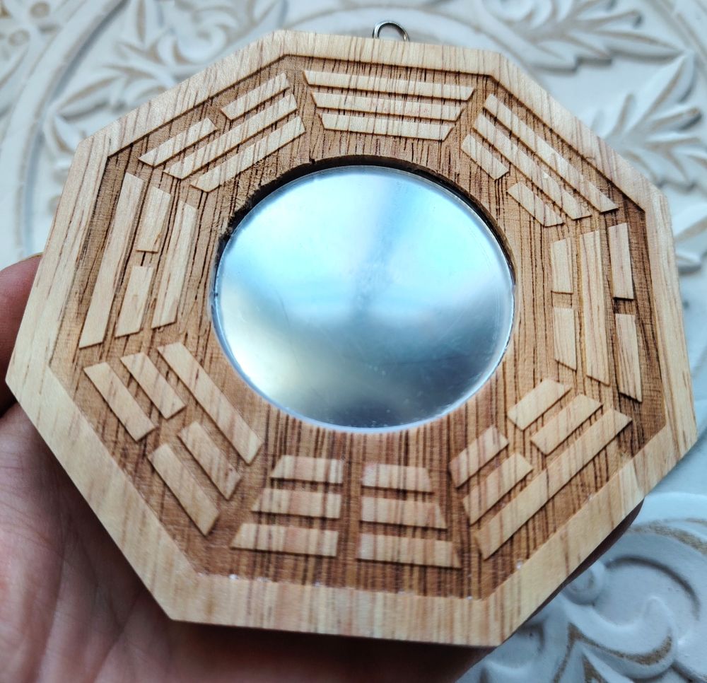 Tuotteesta: tämä peili on kupera malli, halkaisija 10,5 cm. Valmistettu puusta. Valmis ripustus ylhäällä, jotta tiedät mikä trigrammi on ylhäällä. Huomioithan että tässä peilissä kupera pinta on heijastavaa materiaalia ei oikeaa peiliä.
