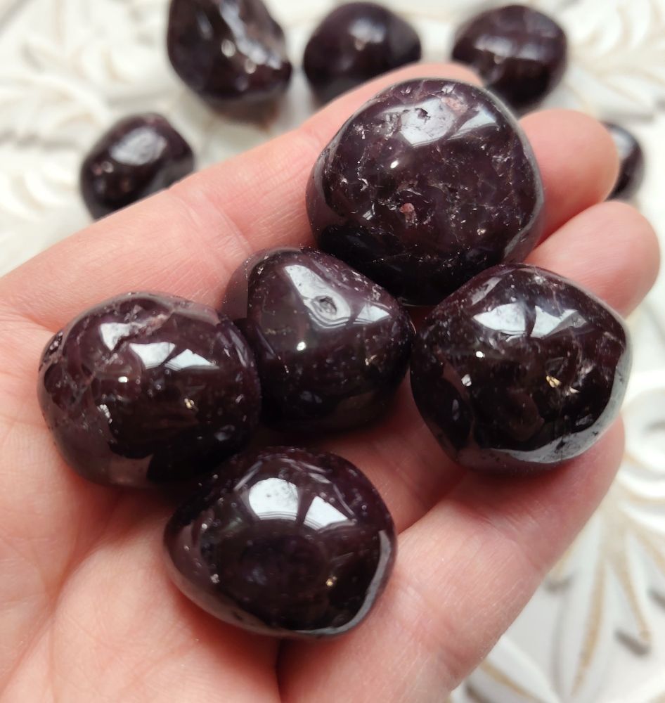 Upeaa tummanpunaista hiottua granaattia (almandine) Intiasta. Saat itsellesi yhden kuvassa näkyvistä kivistä. Yhden kiven paino vaihtelee 20g-30g välillä (erässä pari yli 30g painoistakin). Koko n. 2 cm x 2 cm/ 2,5 cm x 3 cm.