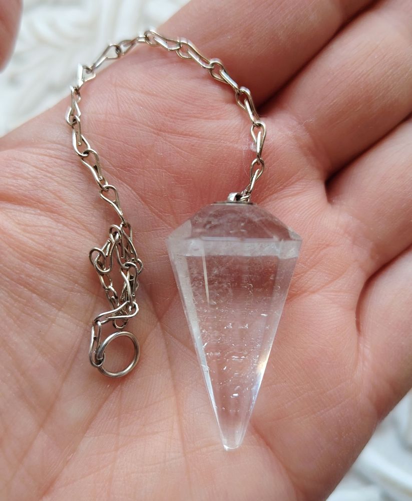 Kaunis vuorikristallista tehty heiluri, joka on kartionmalliin hiottu. Hopeanvärinen ketju. Kiven koko on n. 3 -4 cm ja heilurin pituus ketjun kanssa on 18-20 cm. Kivessä voi näkyä vuorikristallikiven sulkeutumia. Vuorikristallin alkuperä on Brasilia