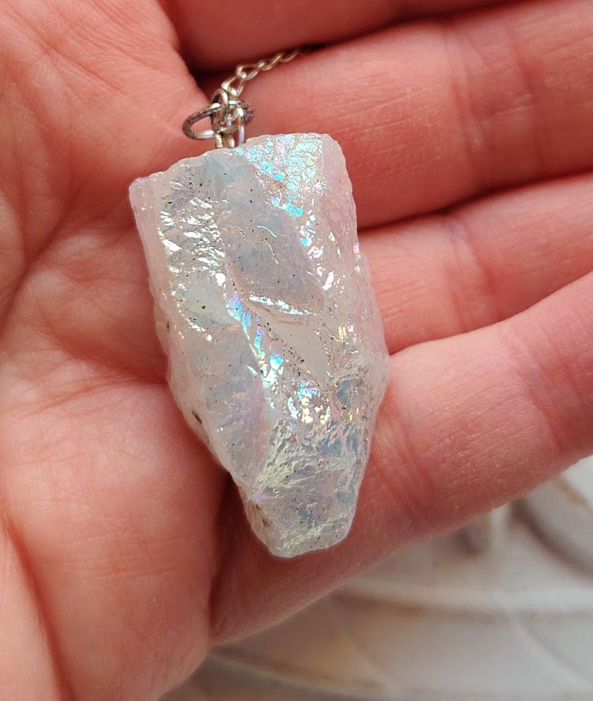 Shamaanittaren kivi-info: Uudenajan aurakvartsit ovat kvartseja joiden pintaan "sidotaan" jalometalleja. Valkoisessa aurakvartsissa, jota kutsutaan myös enkeli aurakvartsiksi on kirkas kvartsi sidottuna kultaan ja platinaan; tämä tuottaa valkoisen hohtavan kiteen, jossa on hienovaraisia sateenkaaren häivähdyksiä. Valkoiset aurakvartsit edustavat henkistä puhtautta, selkeyttä ja valaistumista. Ne yhdistetään enkelienergiaan, jumalalliseen yhteyteen ja kommunikointiin korkeampien maailmojen kanssa. Emotionaalinen tasapaino, opastus ja sisäisen rauhan edistäminen ovat tämän aurakvartsin ominaisuuksia.