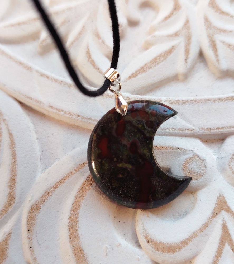 Pulleahko puolikuun muotoinen kiviriipus, joka on tehty lohikäärmekivestä (dragonstone). Olen kuvannut ja numeroinut kaikki erikseen eli saat itsellesi kuvassa näkyvän korun. Koko 3 cm x 2,5 cm. Tässä mallissa kumpi puoli tahansa soveltuu etupuoleksi eli voit valita tahdotko kasvan vai laskevan puolikuun. Laitan riipuksen mukaan mustaa vahattua nyörinauhaa, josta voit solmia itsellesi sopivan mittaisen nauhan. Tähän koruun voi vaihtaa oman sopivan ketjun esim nahkanyörin tai hopeaketjun. Kyseessä on hyvälaatuinen kiviriipus, jonka on valmistanut käsityönä Madagaskarin artesaaniyhteisö