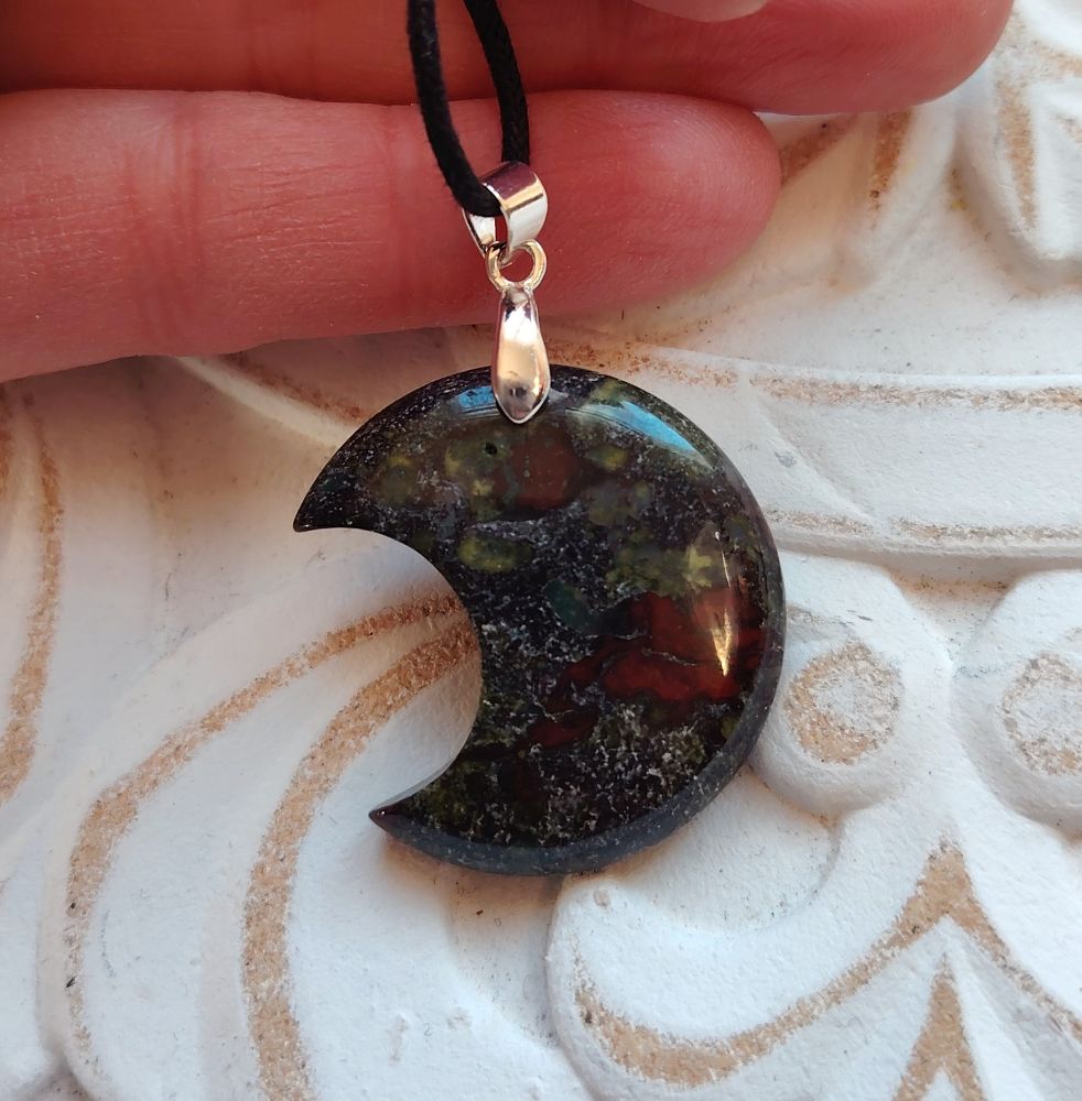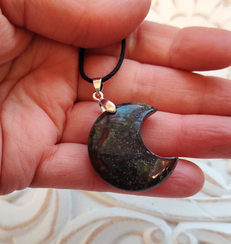 Pulleahko puolikuun muotoinen kiviriipus, joka on tehty lohikäärmekivestä (dragonstone). Olen kuvannut ja numeroinut kaikki erikseen eli saat itsellesi kuvassa näkyvän korun. Koko 3 cm x 2,5 cm. Tässä mallissa kumpi puoli tahansa soveltuu etupuoleksi eli voit valita tahdotko kasvan vai laskevan puolikuun. Laitan riipuksen mukaan mustaa vahattua nyörinauhaa, josta voit solmia itsellesi sopivan mittaisen nauhan. Tähän koruun voi vaihtaa oman sopivan ketjun esim nahkanyörin tai hopeaketjun. Kyseessä on hyvälaatuinen kiviriipus, jonka on valmistanut käsityönä Madagaskarin artesaaniyhteisö