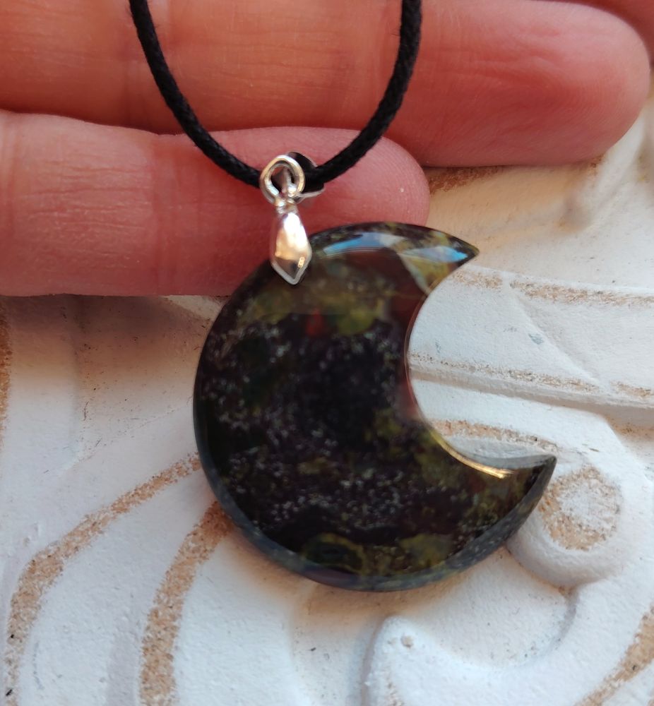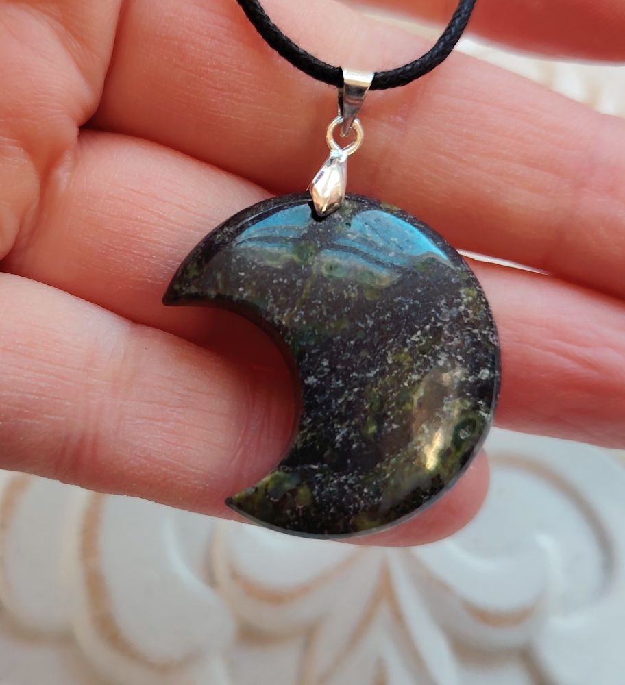 Pulleahko puolikuun muotoinen kiviriipus, joka on tehty lohikäärmekivestä (dragonstone). Olen kuvannut ja numeroinut kaikki erikseen eli saat itsellesi kuvassa näkyvän korun. Koko 3 cm x 2,5 cm. Tässä mallissa kumpi puoli tahansa soveltuu etupuoleksi eli voit valita tahdotko kasvan vai laskevan puolikuun. Laitan riipuksen mukaan mustaa vahattua nyörinauhaa, josta voit solmia itsellesi sopivan mittaisen nauhan. Tähän koruun voi vaihtaa oman sopivan ketjun esim nahkanyörin tai hopeaketjun. Kyseessä on hyvälaatuinen kiviriipus, jonka on valmistanut käsityönä Madagaskarin artesaaniyhteisö
