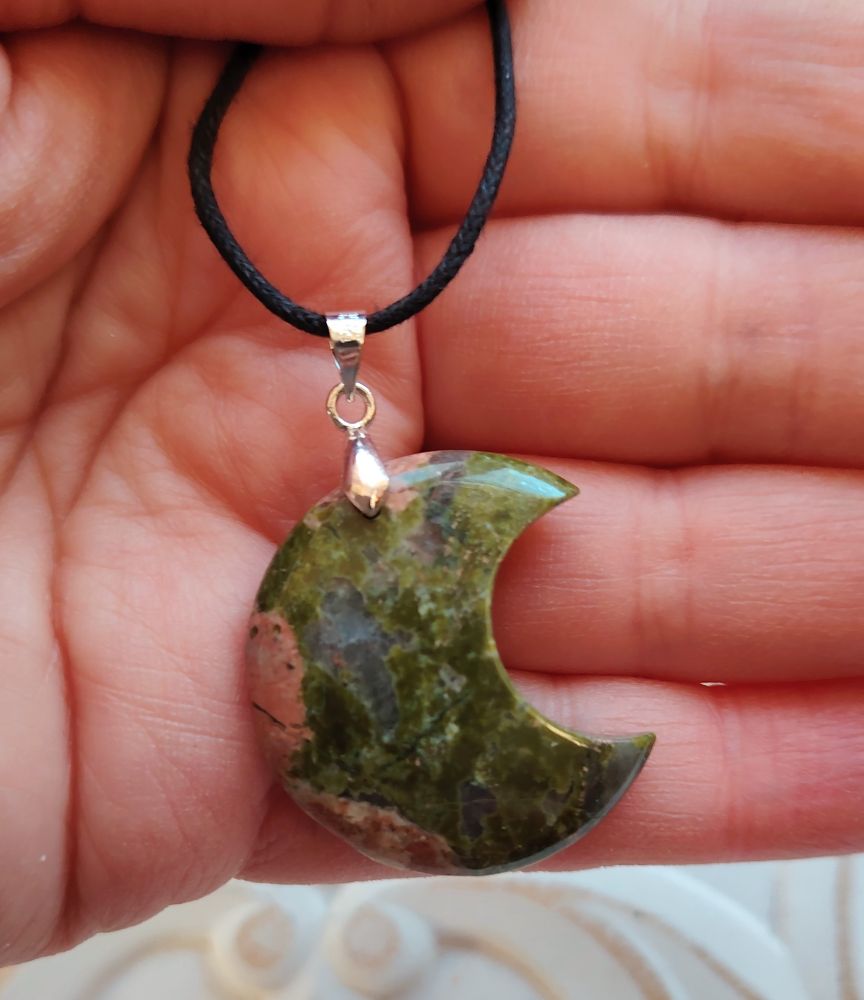 Pulleahko puolikuun muotoinen kiviriipus, joka on tehty unakiitista. Olen kuvannut ja numeroinut kaikki erikseen eli saat itsellesi kuvassa näkyvän korun. Koko 3 cm x 2,5 cm. Tässä mallissa kumpi puoli tahansa soveltuu etupuoleksi eli voit valita tahdotko kasvan vai laskevan puolikuun. Laitan riipuksen mukaan mustaa vahattua nyörinauhaa, josta voit solmia itsellesi sopivan mittaisen nauhan. Tähän koruun voi vaihtaa oman sopivan ketjun esim nahkanyörin tai hopeaketjun. Kyseessä on hyvälaatuinen kiviriipus, jonka on valmistanut käsityönä Madagaskarin artesaaniyhteisö