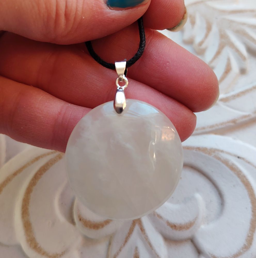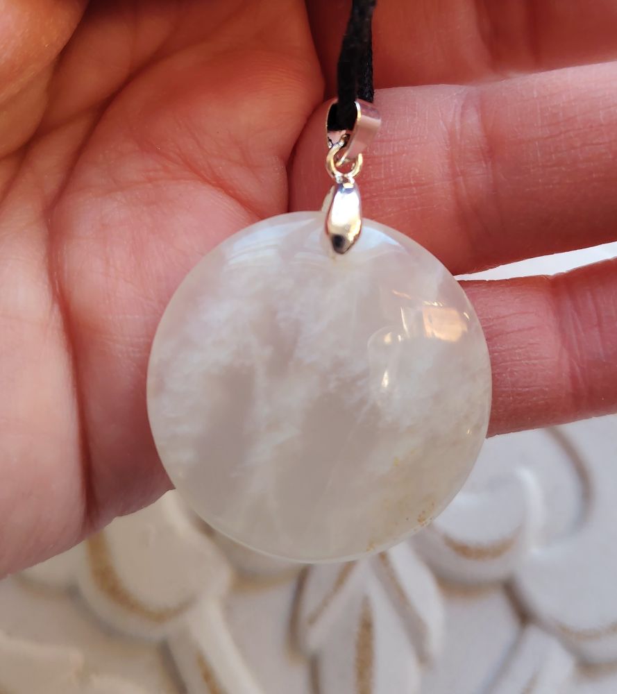 Pulleahko täydenkuun muotoinen kiviriipus, joka on tehty valkoisesta kuukivestä. Olen kuvannut ja numeroinut jokaisen erikseen eli saat itsellesi kuvassa näkyvän korun. Tämä täysikuu on halkaisijaltaan 3 cm. Tässä mallissa kumpi puoli tahansa soveltuu etupuoleksi. Laitan riipuksen mukaan mustaa vahattua nyörinauhaa, josta voit solmia itsellesi sopivan mittaisen nauhan. Tähän koruun voi vaihtaa oman sopivan ketjun esim nahkanyörin tai hopeaketjun. Kyseessä on hyvälaatuinen kiviriipus, jonka on valmistanut käsityönä Madagaskarin artesaaniyhteisö.