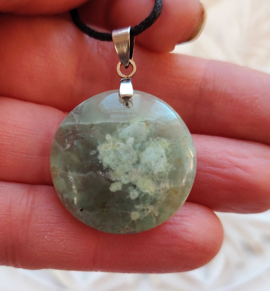 Pulleahko täydenkuun muotoinen kiviriipus, joka on tehty vihreästä kuukivestä. Olen kuvannut ja numeroinut jokaisen erikseen eli saat itsellesi kuvassa näkyvän korun. Tämä täysikuu on halkaisijaltaan 2,5 cm. Tässä mallissa kumpi puoli tahansa soveltuu etupuoleksi. Laitan riipuksen mukaan mustaa vahattua nyörinauhaa, josta voit solmia itsellesi sopivan mittaisen nauhan. Tähän koruun voi vaihtaa oman sopivan ketjun esim nahkanyörin tai hopeaketjun. Kyseessä on hyvälaatuinen kiviriipus, jonka on valmistanut käsityönä Madagaskarin artesaaniyhteisö.