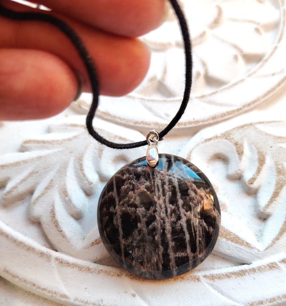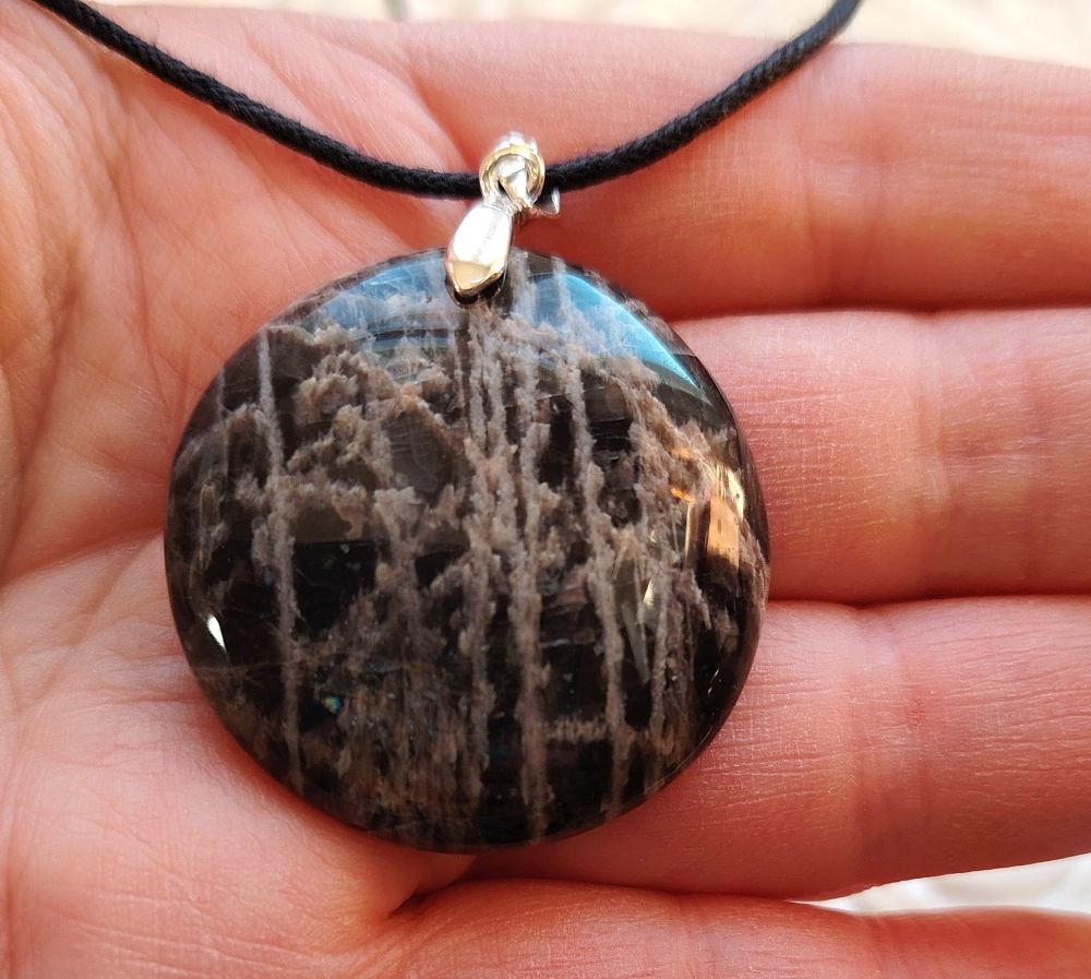 Pulleahko pyöreä kiviriipus, joka on tehty mustasta kuukivestä. Olen kuvannut ja numeroinut jokaisen erikseen eli saat itsellesi kuvassa näkyvän korun. Tämä pyöreä "uusikuu" on halkaisijaltaan 3,5 cm. Tässä mallissa kumpi puoli tahansa soveltuu etupuoleksi. Laitan riipuksen mukaan mustaa vahattua nyörinauhaa, josta voit solmia itsellesi sopivan mittaisen nauhan. Tähän koruun voi vaihtaa oman sopivan ketjun esim nahkanyörin tai hopeaketjun. Kyseessä on hyvälaatuinen kiviriipus, jonka on valmistanut käsityönä Madagaskarin artesaaniyhteisö.
