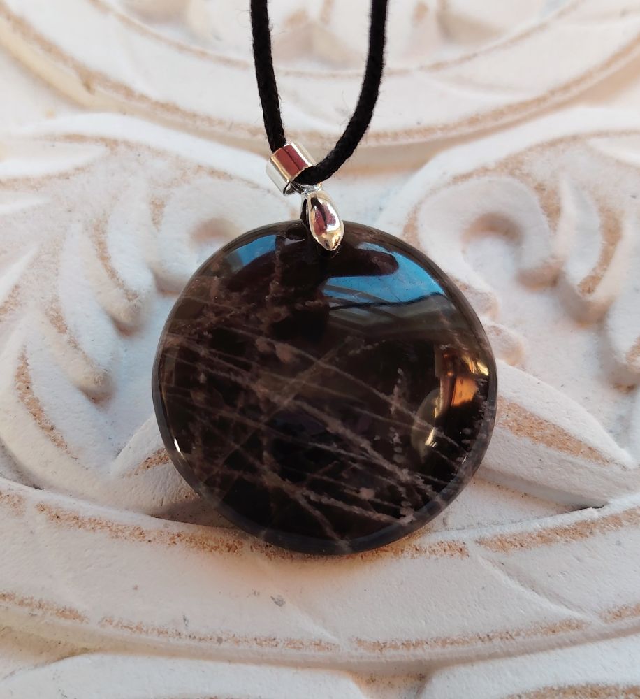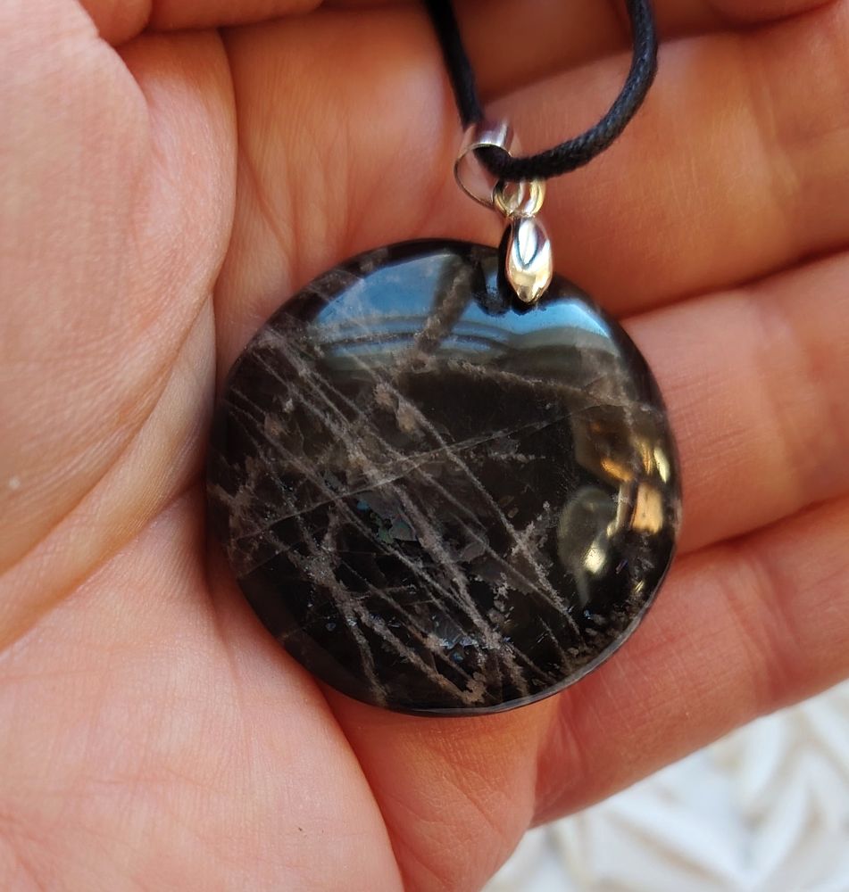 Pulleahko pyöreä kiviriipus, joka on tehty mustasta kuukivestä. Olen kuvannut ja numeroinut jokaisen erikseen eli saat itsellesi kuvassa näkyvän korun. Tämä pyöreä "uusikuu" on halkaisijaltaan 3,5 cm. Tässä mallissa kumpi puoli tahansa soveltuu etupuoleksi. Laitan riipuksen mukaan mustaa vahattua nyörinauhaa, josta voit solmia itsellesi sopivan mittaisen nauhan. Tähän koruun voi vaihtaa oman sopivan ketjun esim nahkanyörin tai hopeaketjun. Kyseessä on hyvälaatuinen kiviriipus, jonka on valmistanut käsityönä Madagaskarin artesaaniyhteisö.