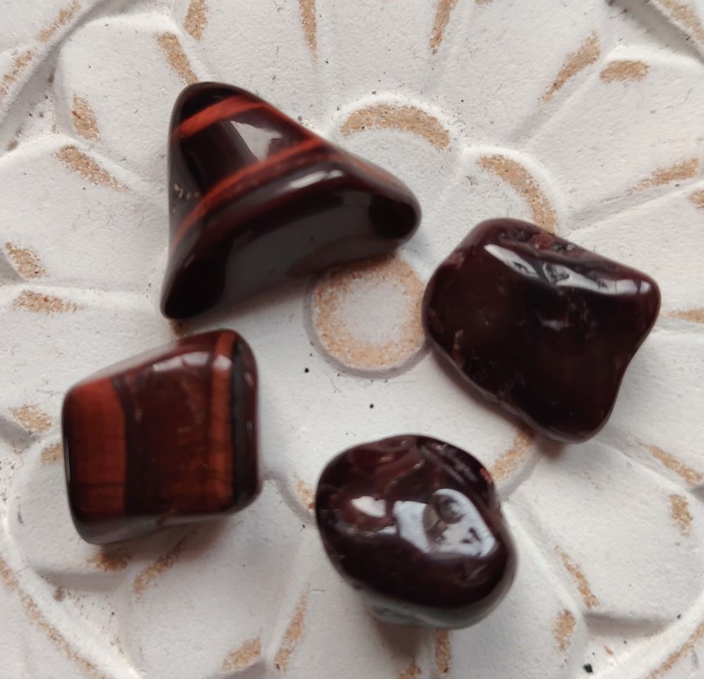 Tässä setissä on 2 kpl tummanpunaista granaattia ja 2 kpl punaista tiikerinsilmää (häränsilmä/lohikäärmeensilmä). Saat kuvassa näkyvät kivet itsellesi. Kivien ovh hinta 4€/kpl. Muodot vaihtelevat, mutta kiven koko about 2 x 2 cm/ 2 x 3 cm.