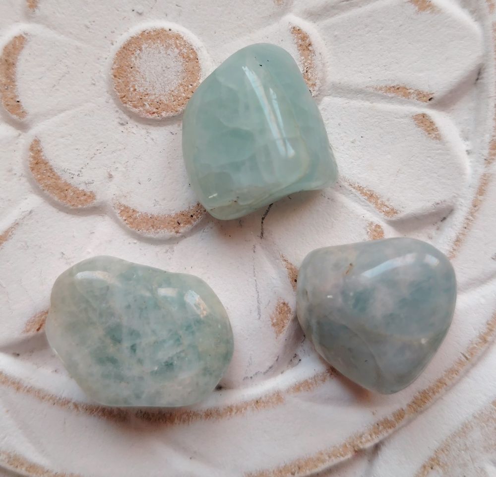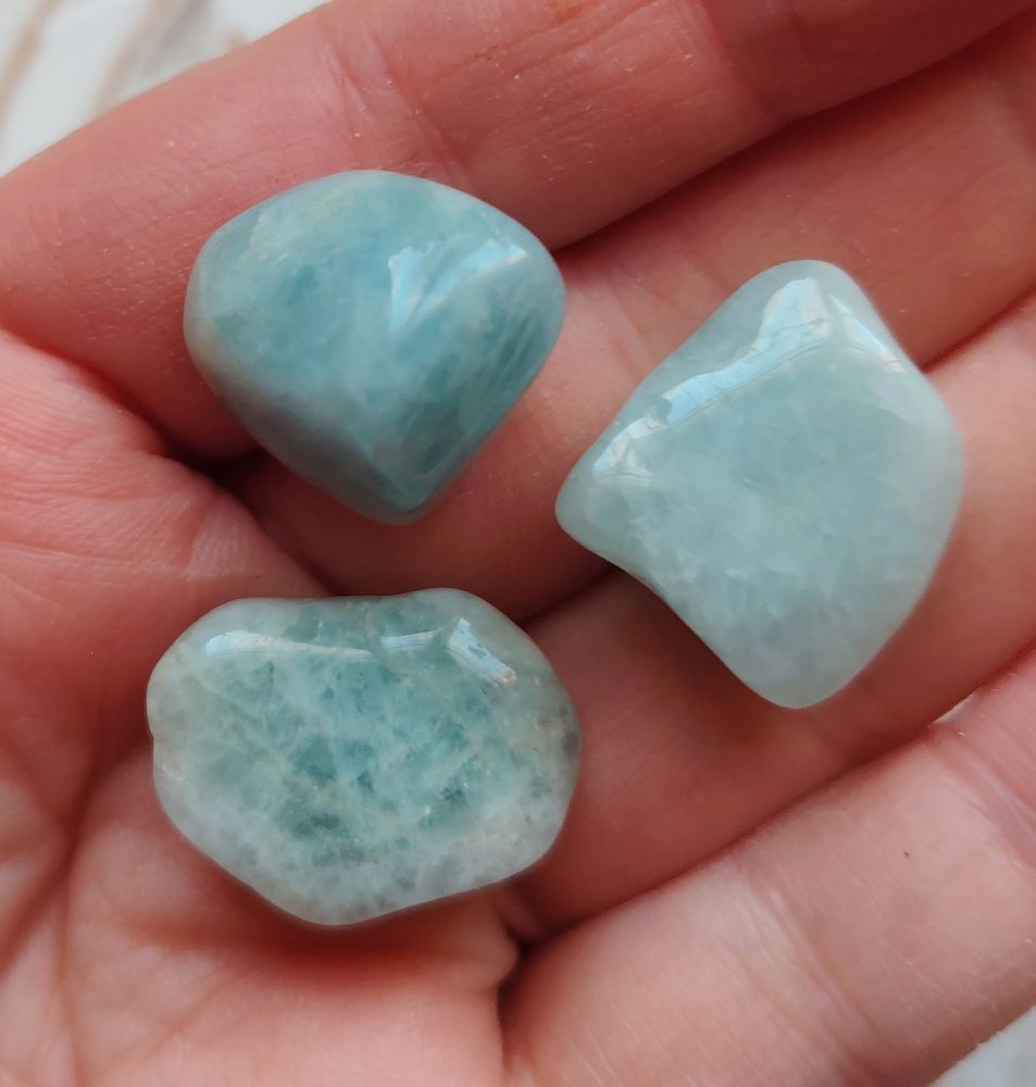 Tässä setissä on kolme rumpuhiottua akvamariinia. Väri on sinertävä. Saat itsellesi kuvassa näkyvät kivet. Ovh 6€/kpl. Yhden kiven koko n. 2 x 2/ 2 x 3 cm