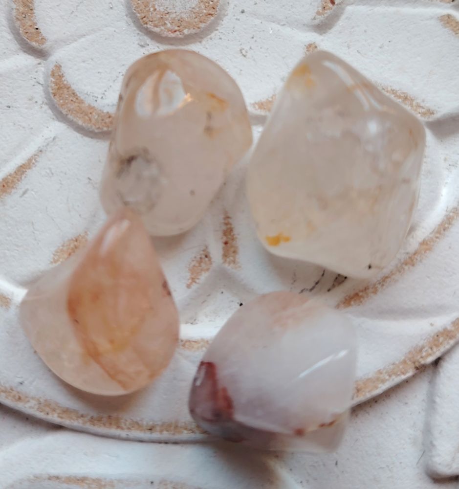Tässä setissä on neljä rumpuhiottua golden healer kvartsia (limoniittikvartsi). Nämä ovat kooltaan n. 2 x 2 cm. Saat itsellesi kuvassa näkyvät kivet. Kivien alkuperä on Brasilia. Ovh 3,50€/kpl.