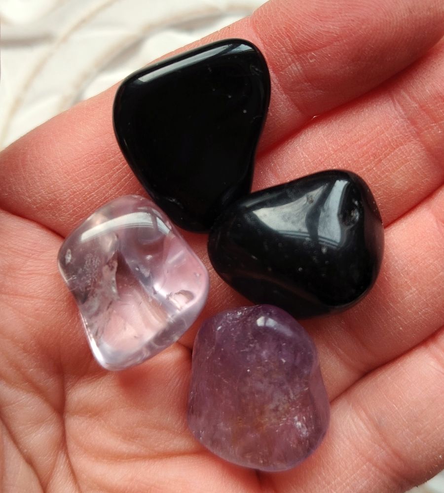 Tässä setissä on 2 kpl mustaa obsidiaania ja 2 kpl ametistia. Saat kuvassa näkyvät kivet itsellesi. Kivien ovh hinta 4€/kpl. Muodot vaihtelevat, mutta kiven koko about 2 x 2 cm.