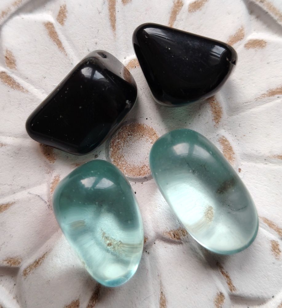 Tässä setissä on 2 kpl mustaa obsidiaania ja 2 kpl sinistä obsidiaania (sininen on man made eli synteettisesti valmistettu). Saat kuvassa näkyvät kivet itsellesi. Kivien ovh hinta 4€/kpl. Muodot vaihtelevat, mutta kiven koko about 2 x 2 cm/3cm.