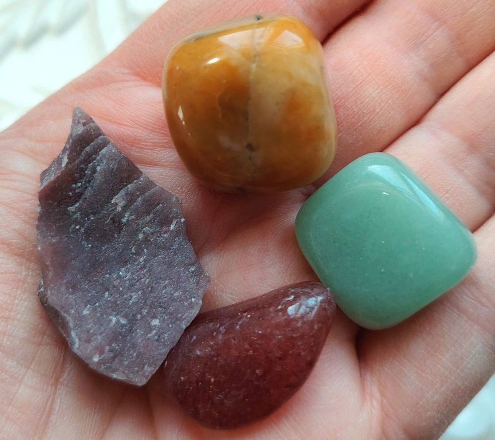 Käytä näitä kiviä houkuttamaan elämääsi enemmän vaurautta, vitaliteettia, suojelua ja toiveiden manifestoitumista. Kivimaailmassa aventuriinia sanotaan yhdeksi onnekkaimmaksi kiveksi, joka kutsuu onnea ja vaurautta omistajansa elämään. Tässä setissä on hiottu punainen aventuriini, raakapala punaista aventuriinia, hiottu keltainen aventuriini sekä hiottu vihreä aventuriini. Kivet ovat kooltaan 2-3cm. Saat itsellesi kuvassa näkyvät kivet!