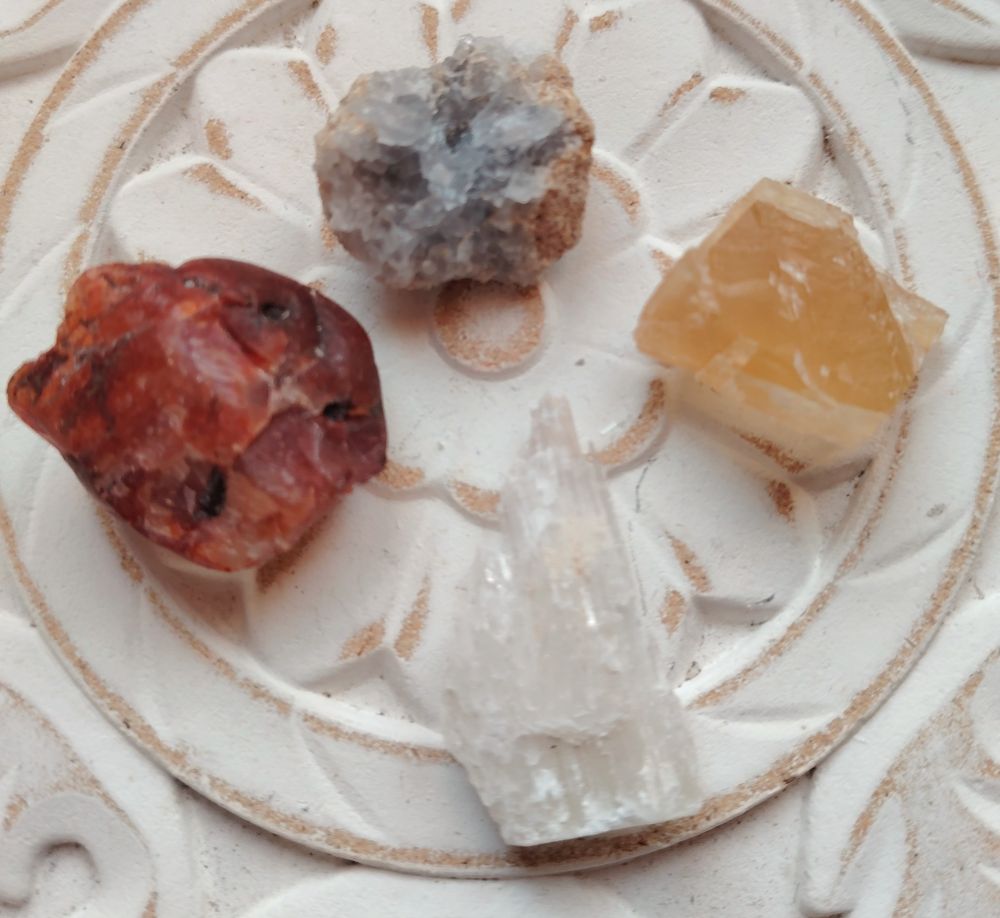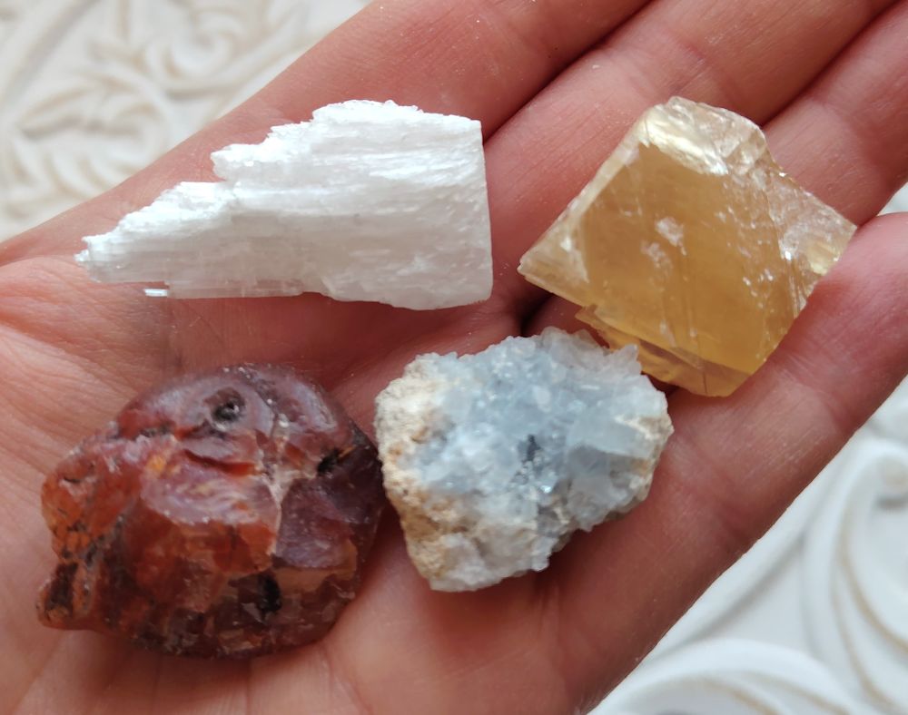 Tässä setissä on neljä raakapalaa; karneoli, hunajakalsiitti, seleniitti ja selestiitti. Saat kuvassa näkyvät kivet itsellesi. Kivien ovh hinta 3€-4€/kpl.