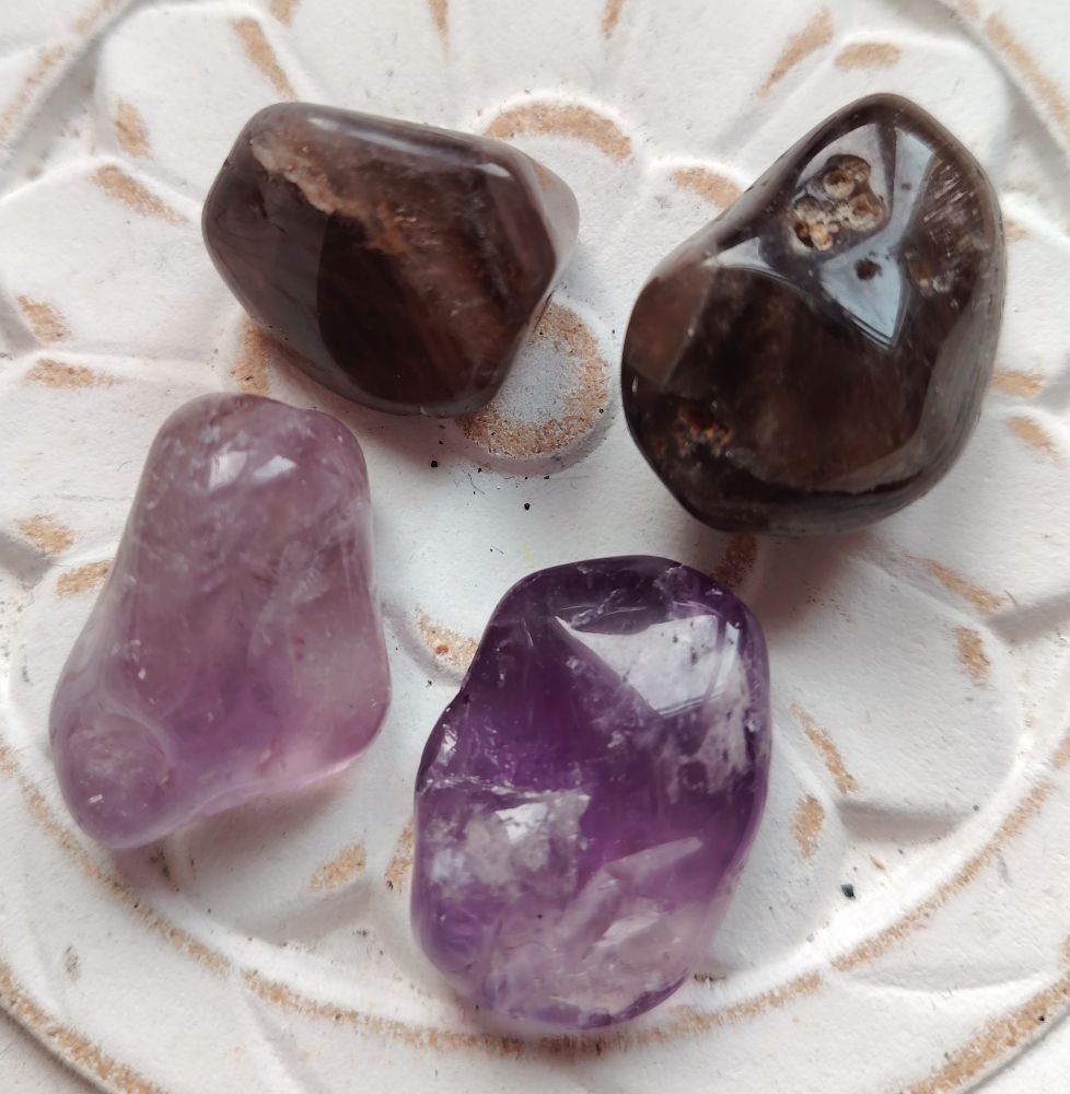 Tässä setissä on 2 kpl tummaa savukvartsia ja 2 kpl ametisteja. Saat kuvassa näkyvät kivet itsellesi. Kivien ovh hinta 4€-5€/kpl. Muodot vaihtelevat, mutta kiven koko about 2 x 2 cm/3cm.