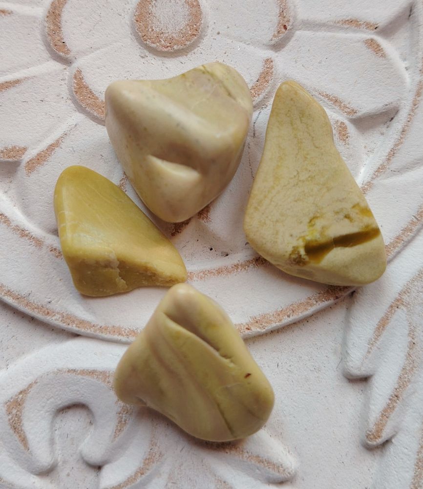 Tässä setissä on neljä rumpuhiottua serpentiiniä. Kivien koko on n. 2 cm x 3 cm. Väri on vaaleanvihertävä/kellertävä. Saat itsellesi kuvassa näkyvät kivet. Ovh 4€/kpl.