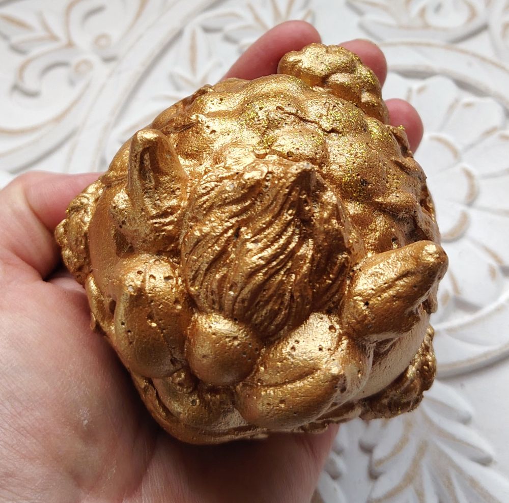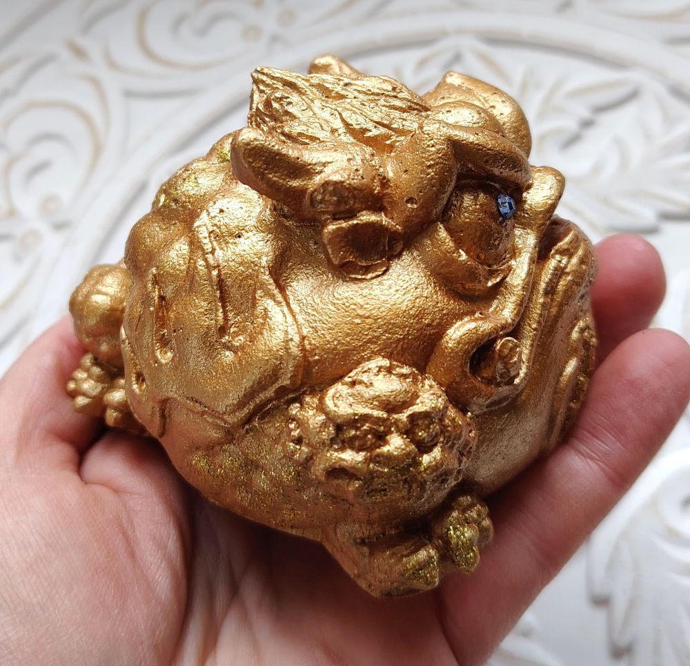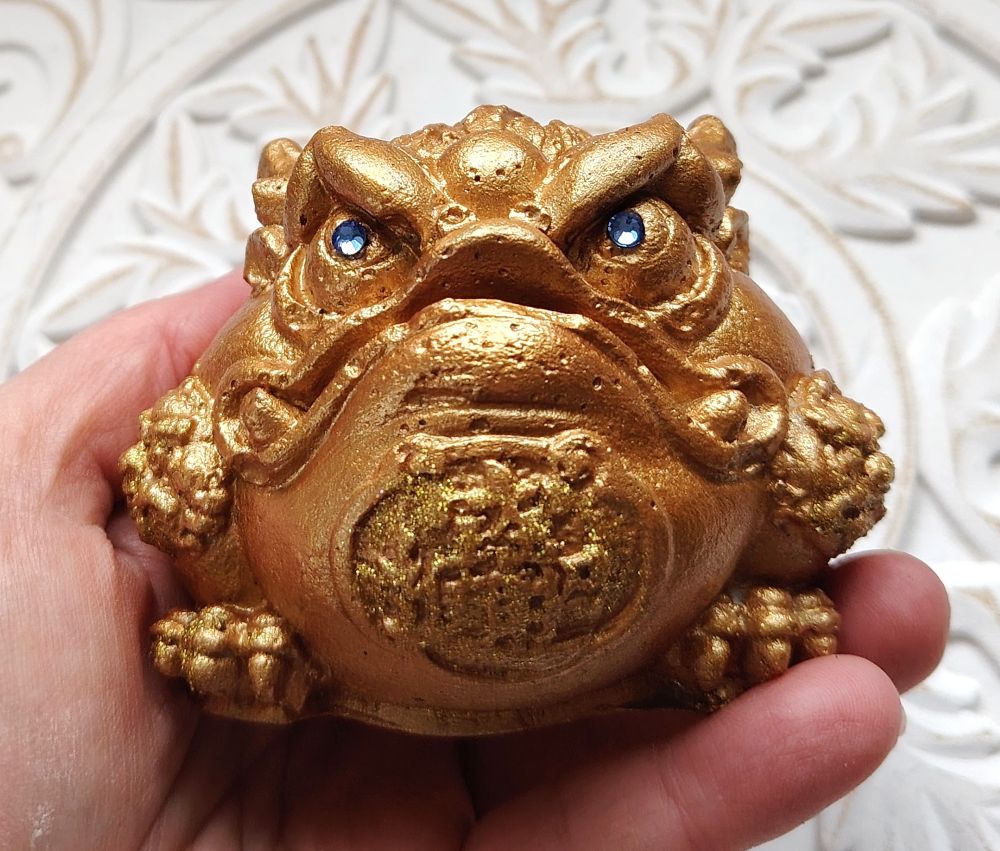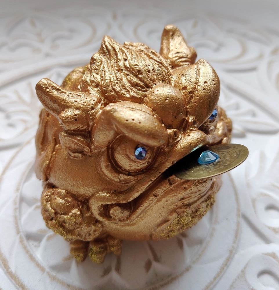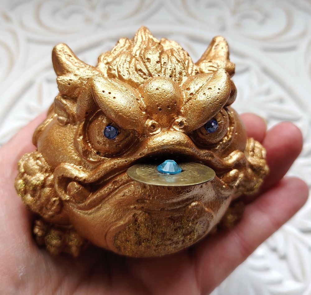 Shamaanittaren käsityönä valmistettuja Feng Shui patsaita. Tässä on hieman kookkaampi rahasammakko, jolla on siniset "timantti" silmät ja kolikossa oleva "timantti" on myös sininen. Raha suussa on irtonainen ja sen voi kiinnittää tukevammin kiinni esim. sinitarralla. Toistaiseksi vain tämä 1 kpl saatavilla tästä mallista. Viimeisessä kuvassa näet mallien eron toiseen sammakkoon verrattuna.