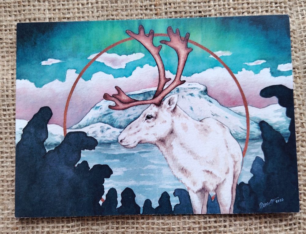 A6 kokoinen värillinen postikortti, jossa maaginen valkoinen poro.