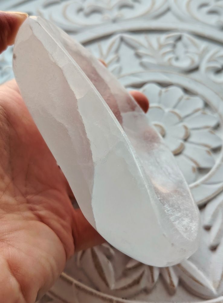 Kaunis seleniitistä tehty puolikuun mallinen kulho. Laadukasta Marokkolaista seleniittiä, kulho on ihanan paksu. Tuotteiden välillä voi olla koko-ja sävyeroja, koska jokainen tuote on uniikki.