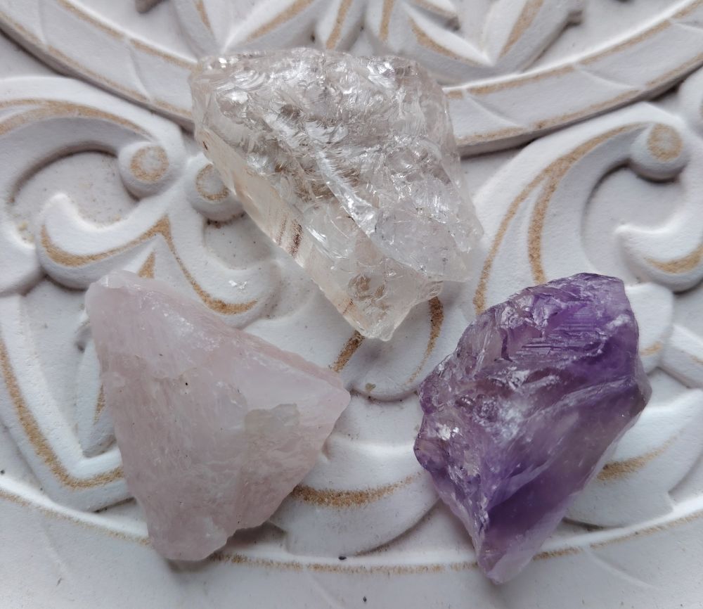 Kivien koot: ruusukvartsi 4 x 4,5 cm, vuorikvartsi 4 x 5,5 cm ja ametisti 3 x 4,5 cm. Saat itsellesi kuvassa näkyvän setin. Kivien yhteispaino 138g.