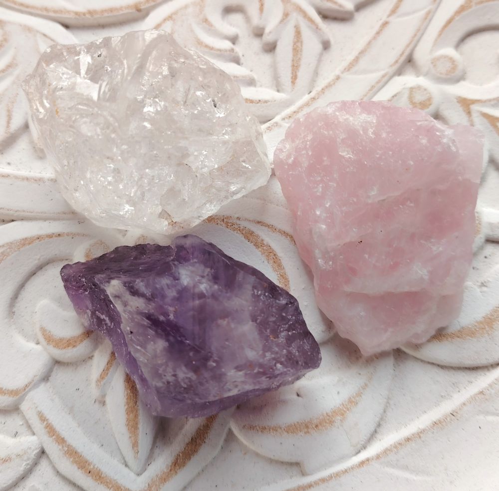 Hieman kookkaampi setti: ruusukvartsi ja vuorikvartsi 5 cm x 4,5 cm ja ametisti 3,5 x 6,5 cm. Saat itsellesi kuvassa näkyvän setin. Kivien yhteispaino 267g.
