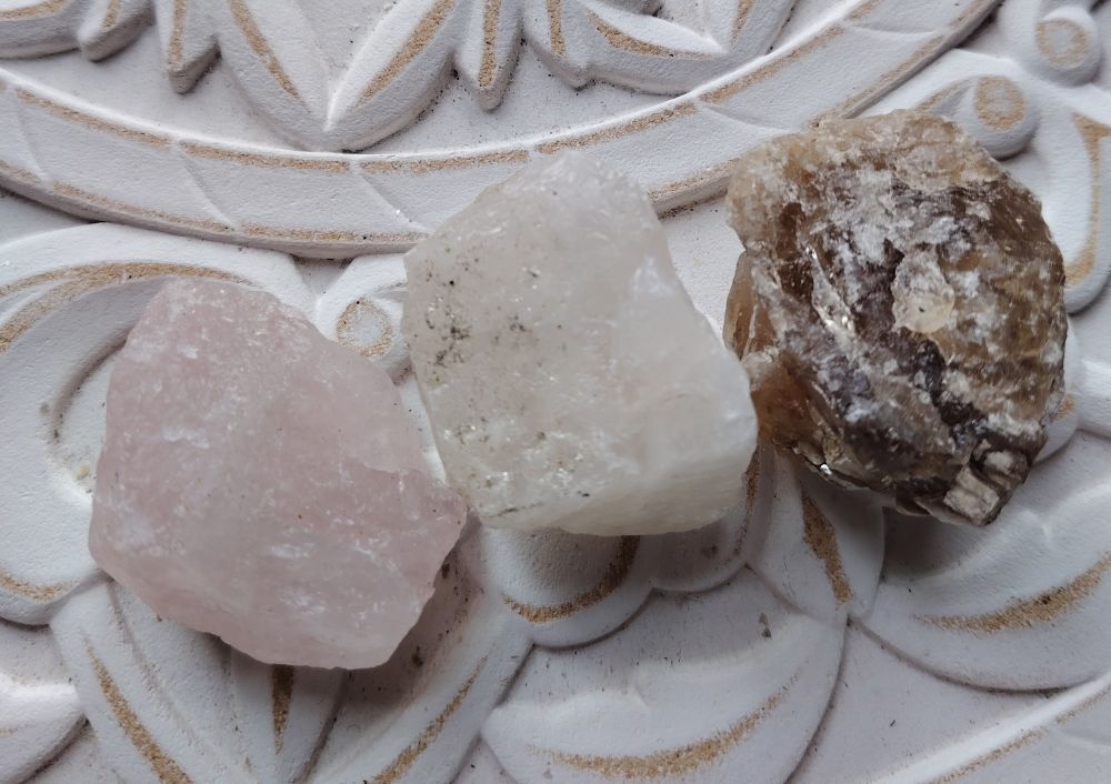 Tässä setissä on kolme Shamaanittaren valitsemaa kvartsia. Savukvartsi ja vuorikvartsi ovat suomalaisia ja peräisin Kuortaneelta, Etelä-Pohjanmaalta. Setin ruusukvartsi on brasilialainen. Uniikki setti eli saat kuvassa näkyvät kivet itsellesi. Setin yhteispaino on 120g. Savukvartsin mitat ovat 3 cm x 4 cm, vuorikvartsin 3 x 4 cm ja ruusukvartsin 3 cm x 4,5 cm.
