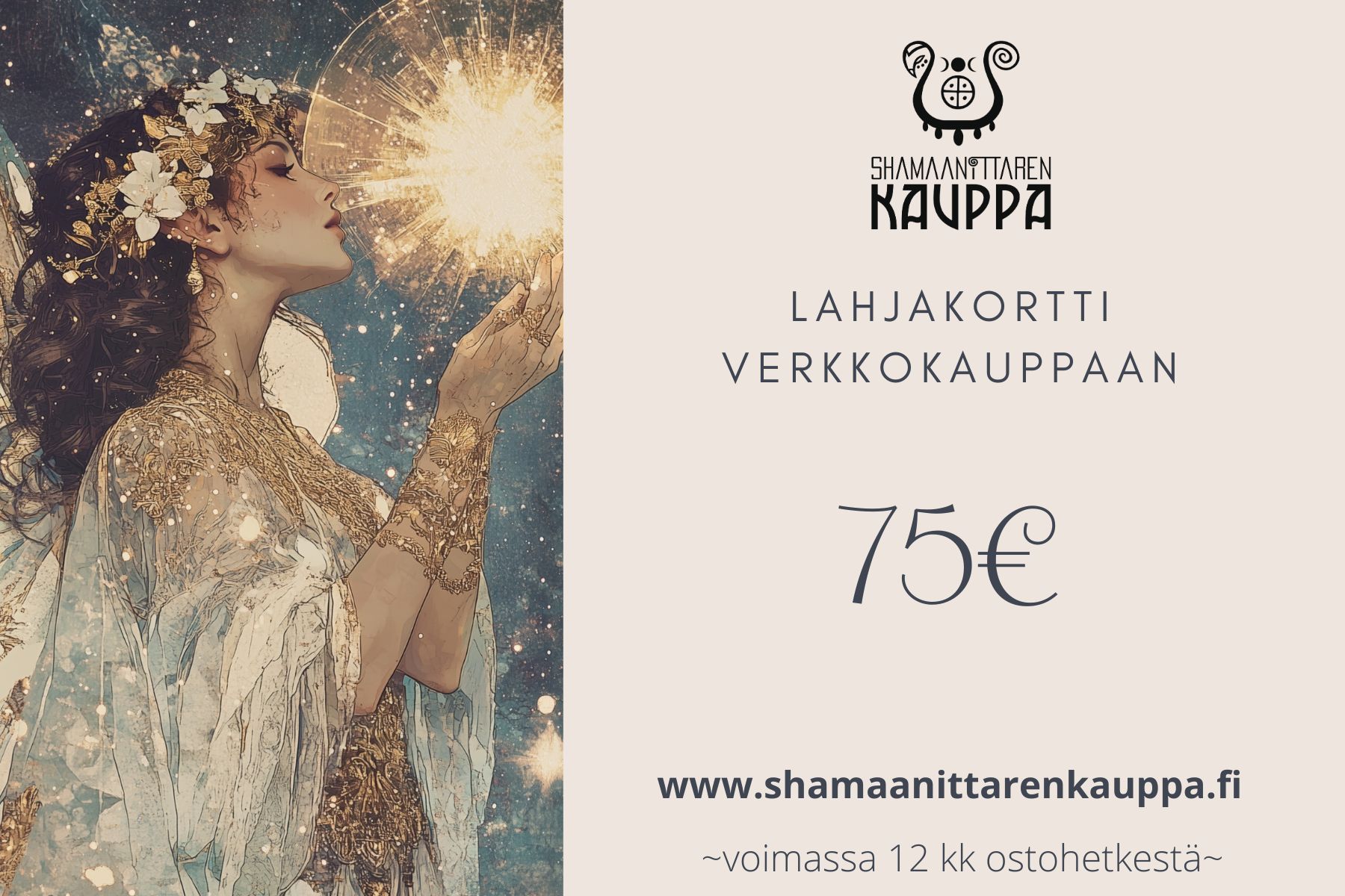 Tämä on sähköinen lahjakortti eli toimitan kuvassa näkyvän lahjakortin sähköisesti (PDF) tiedostona sähköpostiisi. Kun maksat tämän lahjakortin kaupassa valitse toimitustavaksi Sähköinen lahjakortti jolloin toimitusmaksu on 0€. Ostamaasi lahjakorttiin tulee yksilöllinen koodi (ei näy tässä kuvassa) jonka lahjansaaja voi käyttää verkkokauppatilauksen yhteydessä.
