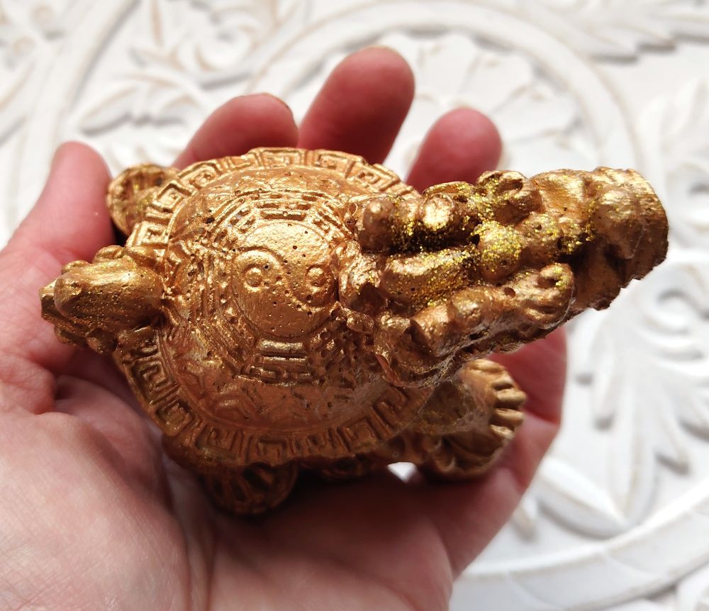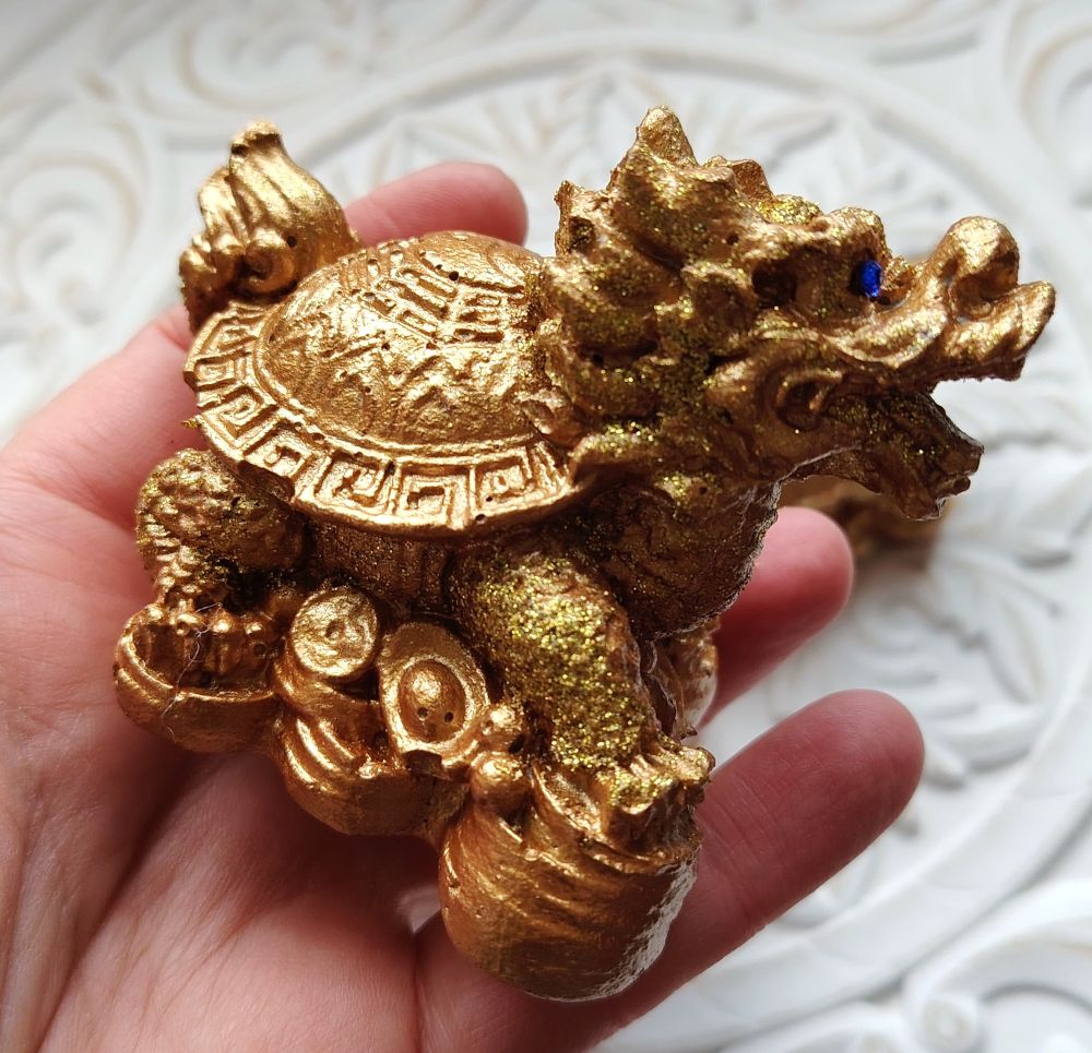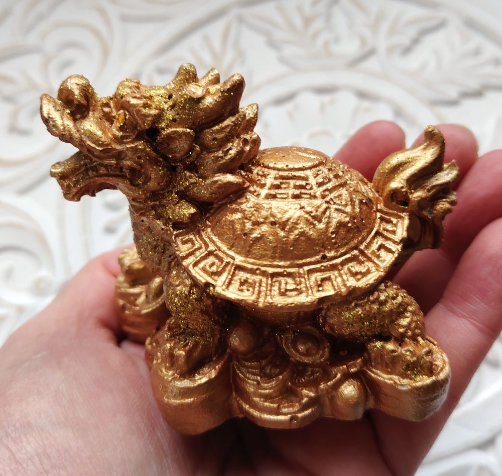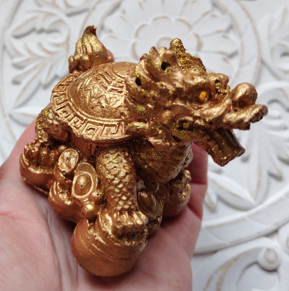 Lohikäärmekilpikonna edustaa kunnianhimoa ja viisautta, sen symboli sopii erityisesti, jos haluaa saavuttaa tavoitteet elämässä. Se on upea uran ja liike-elämän onnen tehoste - erityisesti hyvä haastavassa tai kilpailuhenkisessä ympäristössä. Tällä olennolla on lohikäärmeen hengityksen tai "sheng chin" uskomaton voima yhdistettynä kilpikonnan erityiseen vakauteen. Se on ihanteellinen yhdistelmä kahdesta menestyksen ominaisuudesta: kunnianhimo ja suuri viisaus. Tämä patsas seisoo rahakasan päällä symboloiden vaurauden kertymistä ja uramenestystä. Kilpikonnan kuoressa on taichi symboli ja trigrammit, näillä on suojeleva ominaisuus Feng Shuissa.