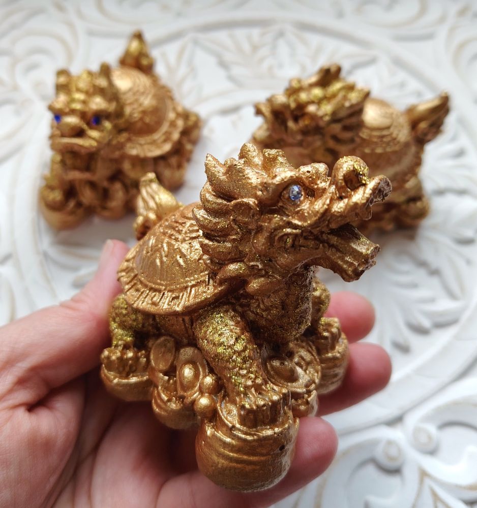 Shamaanittaren käsityönä valmistettuja Feng Shui patsaita. Huomioi, että patsailla on erivärisiä "timantti" silmiä. Nämä kolme ovat ensimmäiset valmistuneet lohikäärmekilpikonnat.