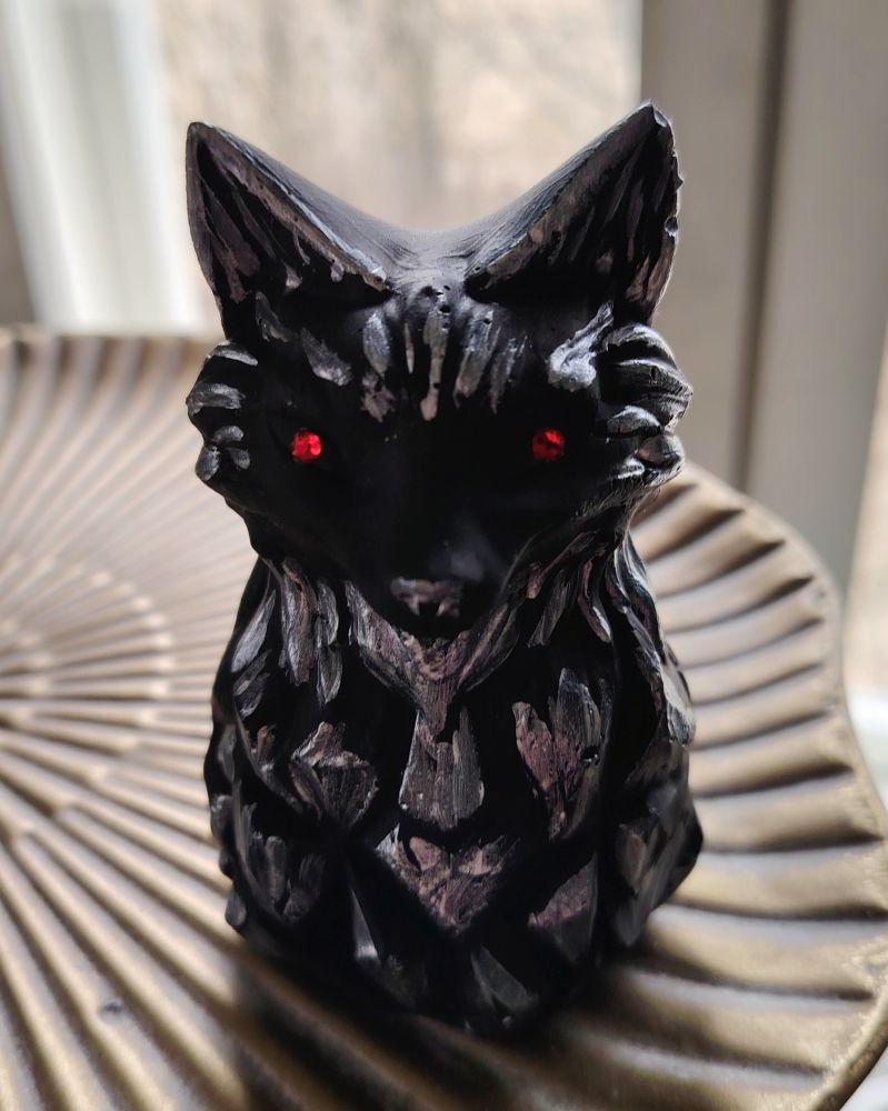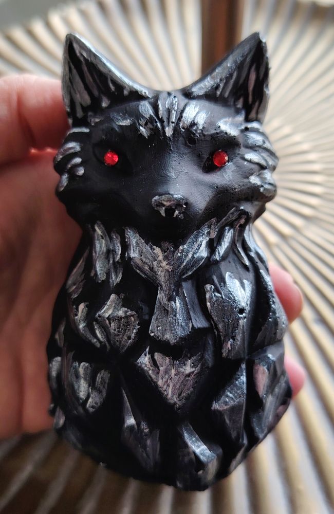Shamaanittaren uniikit patsaat. Tämä on neljäs tekemäni Susi patsas ja tämän väreiksi tuli musta-hopea-silmiksi valikoitui punainen. Saat itsellesi kuvassa näkyvän suden, joka on käsityönä tehty ja viimeistelty Suomessa (hiottu ja maalattu). Käsityön jälki voi näkyä tuotteissa jonkun verran sekä pieniä eroja voi olla tuotteiden välillä.