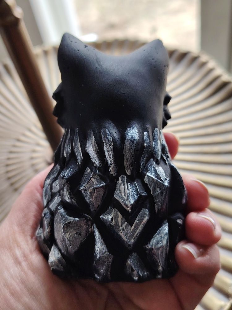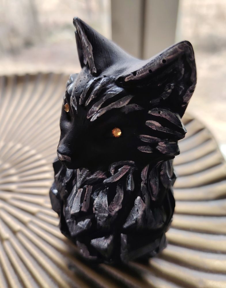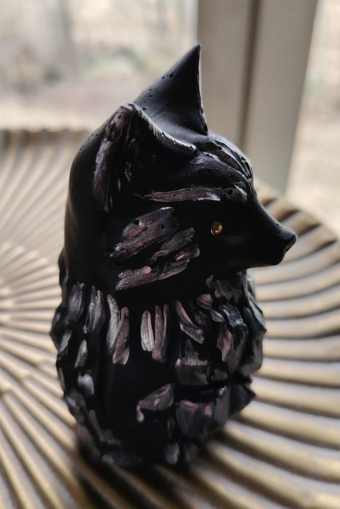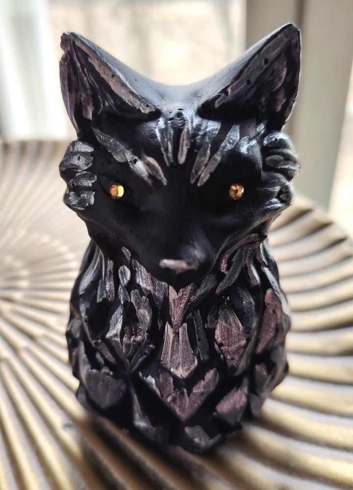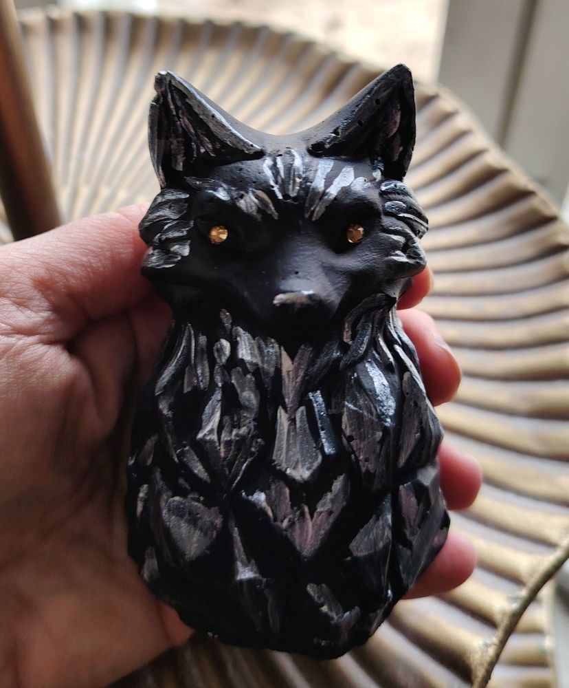 Shamaanittaren uniikit patsaat. Tämä on viides tekemäni Susi patsas ja tämän väreiksi tuli musta-hopea-silmiksi valikoitui keltainen. Saat itsellesi kuvassa näkyvän suden, joka on käsityönä tehty ja viimeistelty Suomessa (hiottu ja maalattu). Käsityön jälki voi näkyä tuotteissa jonkun verran sekä pieniä eroja voi olla tuotteiden välillä.