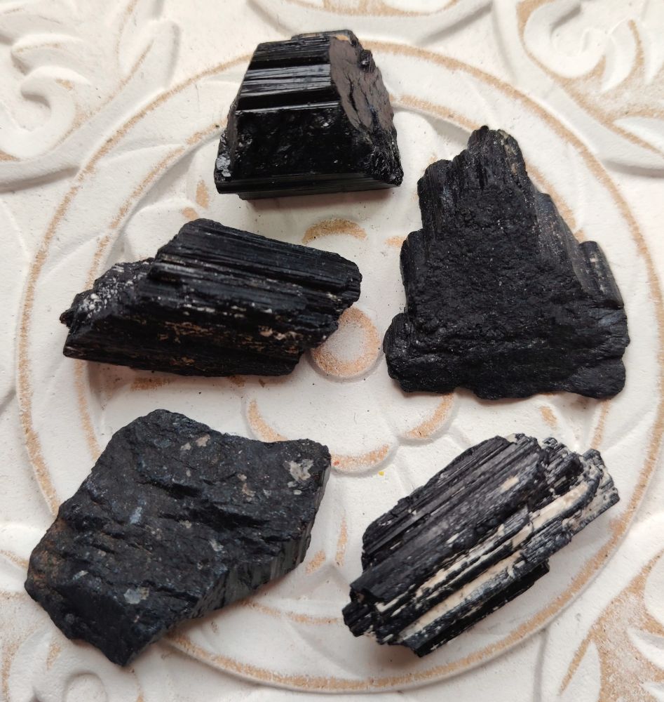 Mustaa turmaliinia Brasiliasta. Saat itsellesi jonkun kuvassa näkyvän kiven. Näiden paino on välillä 21 g- 26 g ja koot muotojen mukaan 2 cm x 5 cm/2,5 x 3 cm/3 x 5cm / 4 x 4cm.