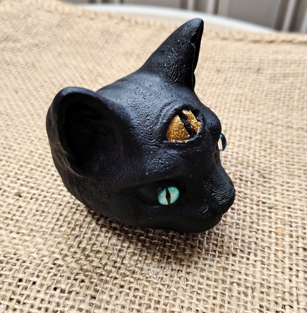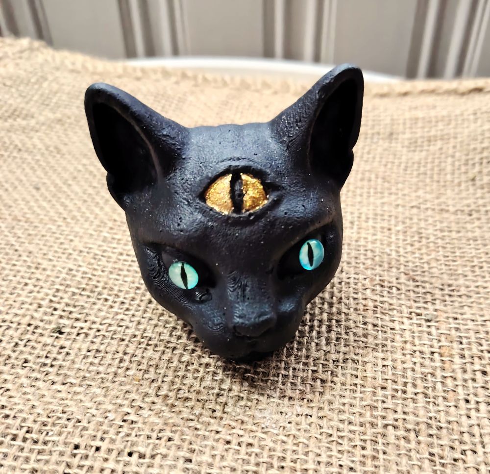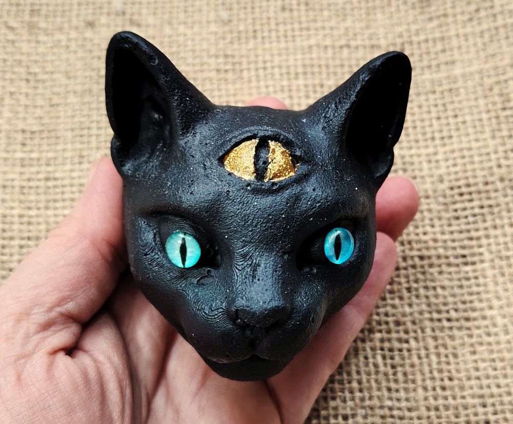 Shamaanittaren uniikit "Näkijä" kissat; jokaisella kissalla on eriväriset silmät, mutta kolmas silmä on kaikilla kullanvärinen. Saat itsellesi kuvassa näkyvän kissan eli tällä on vaaleansiniset silmät. Tämä kissa on musta ja sillä on mattapintainen turkki. Tämä tuote on Shamaanittaren omaa mallistoa eli käsityönä tehty ja viimeistelty Suomessa. Jokainen tuote on myös hiottu ja maalattu käsin. Käsityön jälki voi näkyä tuotteissa jonkun verran sekä pieniä eroja voi olla tuotteiden välillä.