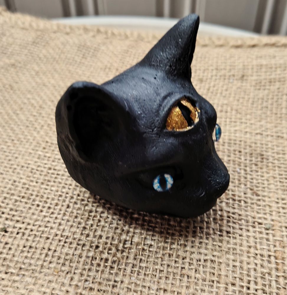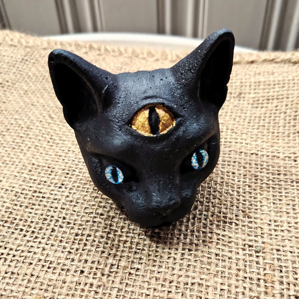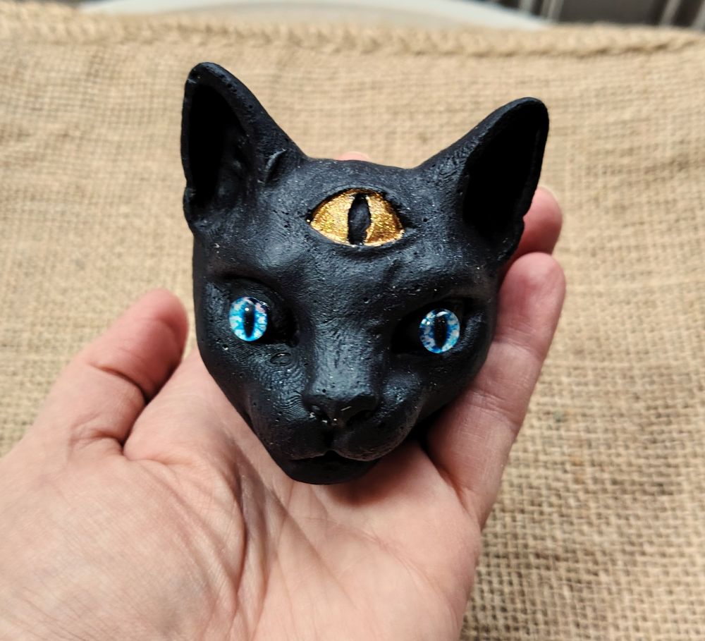 Shamaanittaren uniikit "Näkijä" kissat; jokaisella kissalla on eriväriset silmät, mutta kolmas silmä on kaikilla kullanvärinen. Saat itsellesi kuvassa näkyvän kissan eli tällä on sinivalkoiset silmät. Tämä kissa on musta ja sillä on mattapintainen turkki. Tämä tuote on Shamaanittaren omaa mallistoa eli käsityönä tehty ja viimeistelty Suomessa. Jokainen tuote on myös hiottu ja maalattu käsin. Käsityön jälki voi näkyä tuotteissa jonkun verran sekä pieniä eroja voi olla tuotteiden välillä.