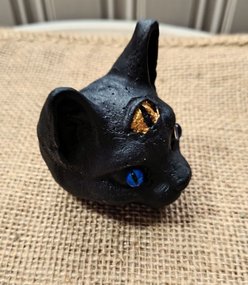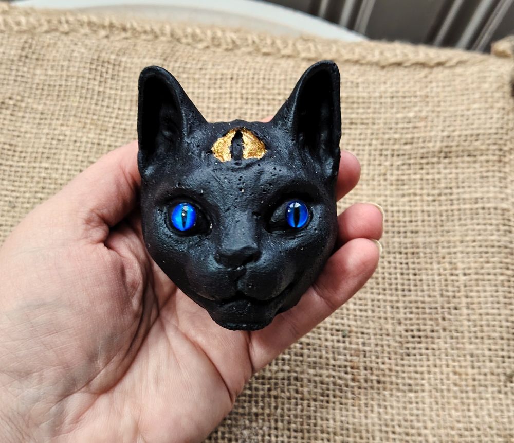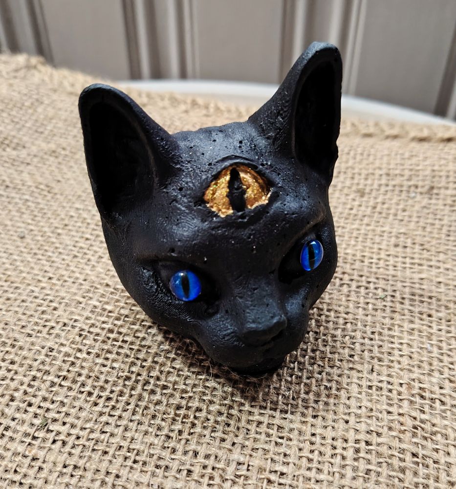 Shamaanittaren uniikit "Näkijä" kissat; jokaisella kissalla on eriväriset silmät, mutta kolmas silmä on kaikilla kullanvärinen. Saat itsellesi kuvassa näkyvän kissan eli tällä on tummansiniset silmät. Tämä kissa on musta ja sillä on mattapintainen turkki. Tämä tuote on Shamaanittaren omaa mallistoa eli käsityönä tehty ja viimeistelty Suomessa. Jokainen tuote on myös hiottu ja maalattu käsin. Käsityön jälki voi näkyä tuotteissa jonkun verran sekä pieniä eroja voi olla tuotteiden välillä.