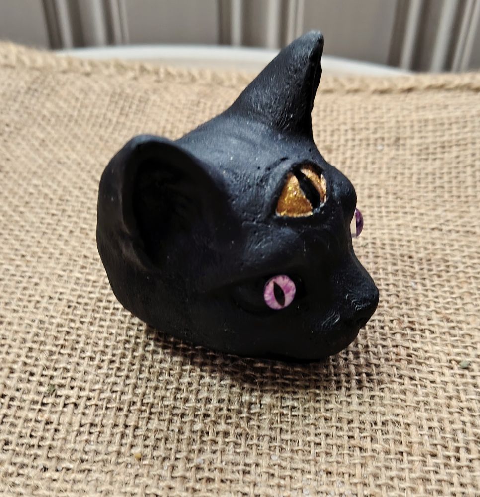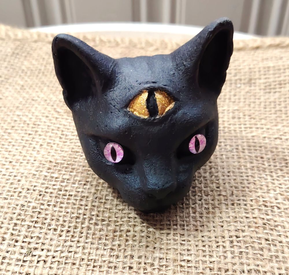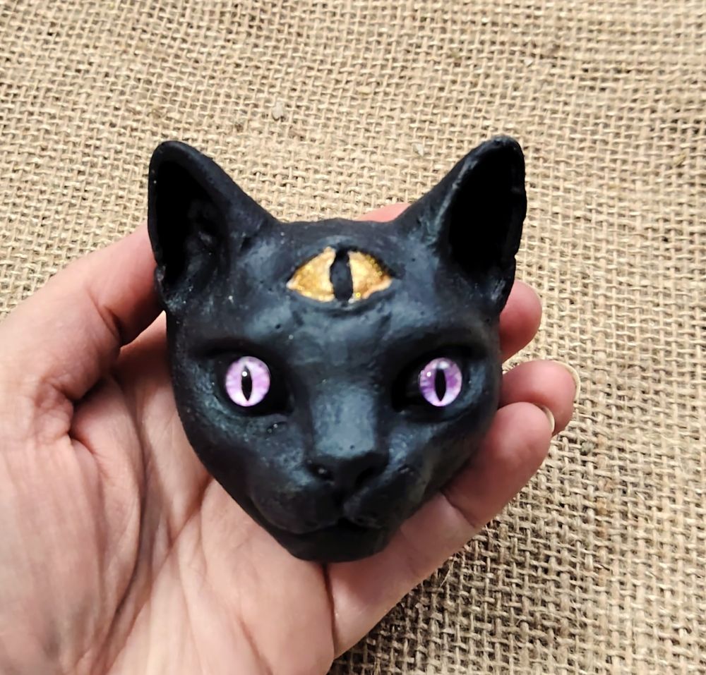 Shamaanittaren uniikit "Näkijä" kissat; jokaisella kissalla on eriväriset silmät, mutta kolmas silmä on kaikilla kullanvärinen. Saat itsellesi kuvassa näkyvän kissan eli tällä on lilat silmät. Tämä kissa on musta ja sillä on mattapintainen turkki. Tämä tuote on Shamaanittaren omaa mallistoa eli käsityönä tehty ja viimeistelty Suomessa. Jokainen tuote on myös hiottu ja maalattu käsin. Käsityön jälki voi näkyä tuotteissa jonkun verran sekä pieniä eroja voi olla tuotteiden välillä.