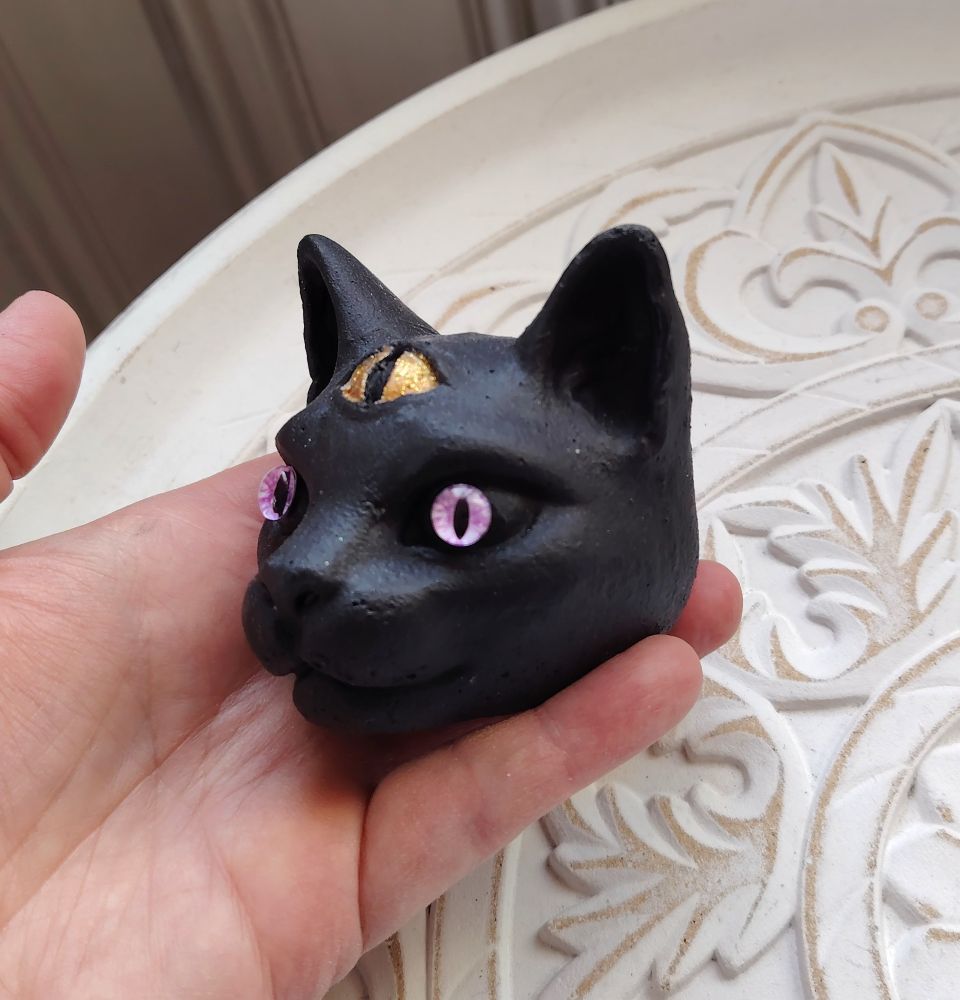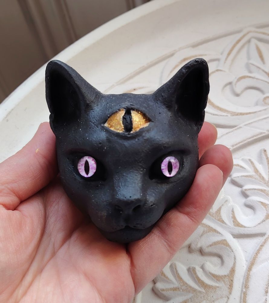 Shamaanittaren käsityönä valmistamat "Näkijä" kissapatsaat; jokaisella kissalla on eriväriset silmät, mutta kolmas silmä on kaikilla kullanvärinen. Saat itsellesi kuvassa näkyvän kissan eli tällä on lilat silmät. Tämä kissa on musta ja sillä on mattapintainen turkki. Jokainen patsas on valettu, hiottu ja maalattu käsin, joten käsityön jälki voi näkyä tuotteissa sekä pieniä eroja voi olla tuotteiden välillä.