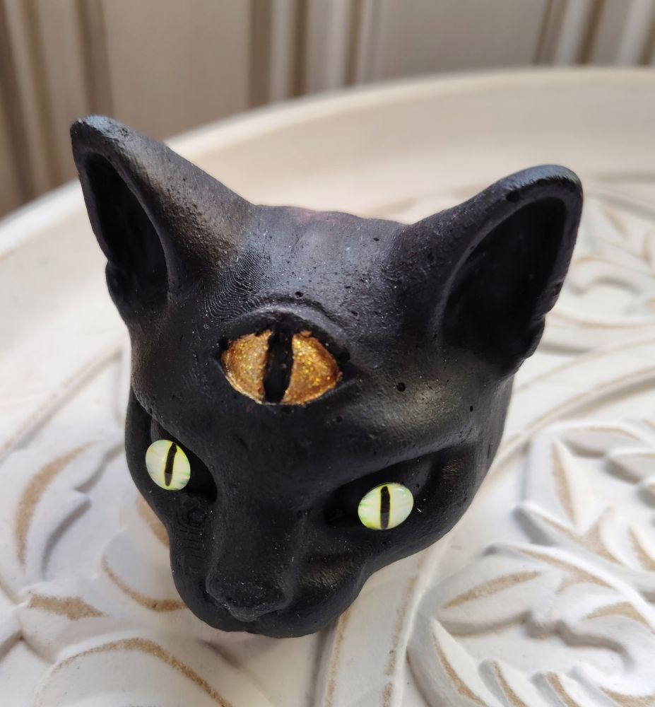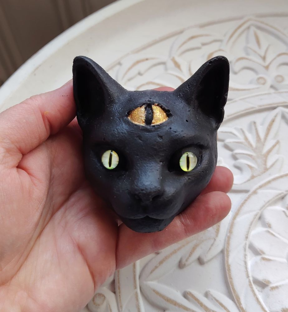Shamaanittaren käsityönä valmistamia "Näkijä" kissapatsaita. Jokaisella kissalla on hieman eriväriset silmät, mutta kolmas silmä on kaikilla kullanvärinen. Saat itsellesi kuvassa näkyvän kissan eli tällä on silmät, jotka taittavat vaaleankeltaista/vaaleanvihreää sävyä. Tämä kissa on musta ja sillä on mattapintainen turkki. Jokainen patsas on valettu, hiottu ja maalattu käsin eli käsityön jälki voi näkyä tuotteissa sekä pieniä eroja voi olla tuotteiden välillä. Joillakin kissoilla on mm. pidemmät korvat kuin toisilla.