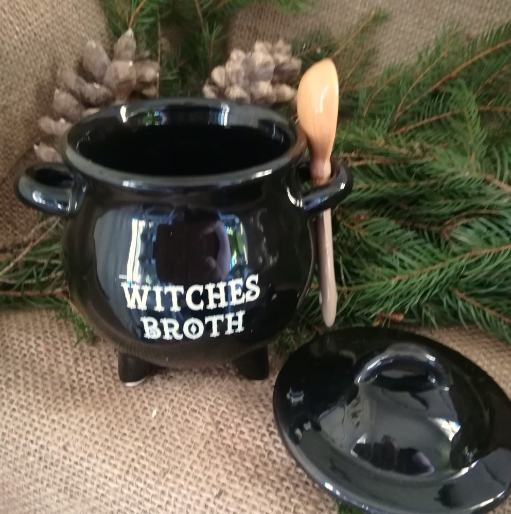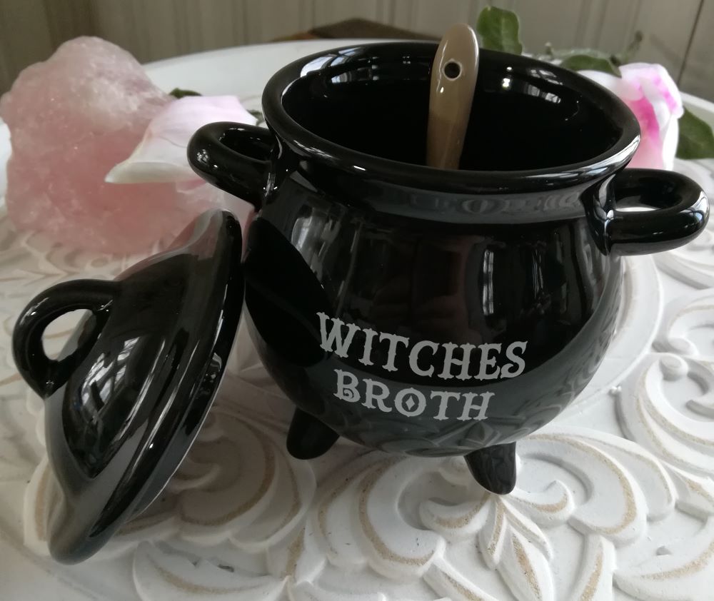 Mustaa keramiikkaa, padassa on kansi sekä lusikka. Padassa teksti "Witches broth" eli tarkoitaa "noidan liemi".
