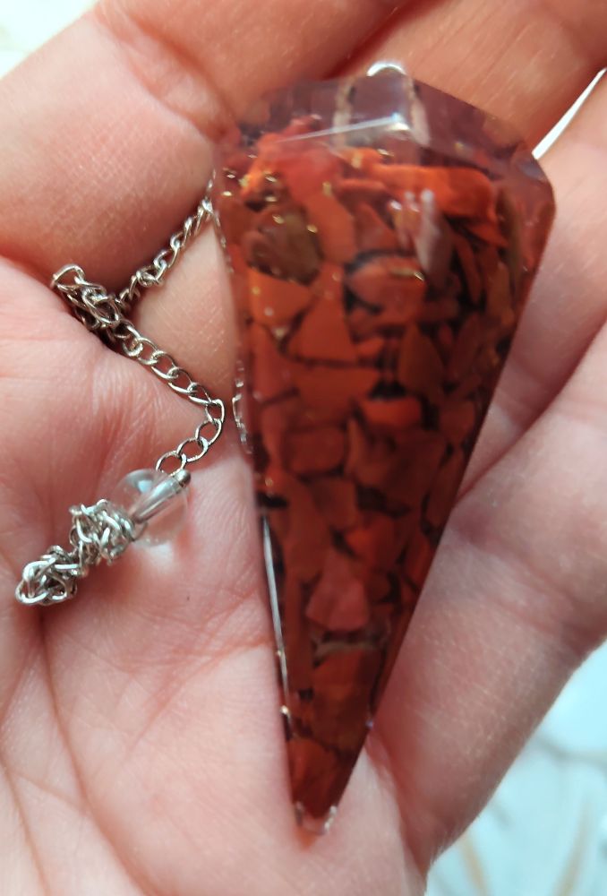 Kutsu elämääsi soturienergiaa ja maan viisautta tällä orgoniittiheilurilla, jossa on punaista jasperia. Epäorgaaninen aine tässä orgoniittissa on kuparia. Punainen jasper tunnetaan ns. kestävyyden kivenä, joka stimuloi chi:tä, elämän voimaa, tuo fyysistä kestävyyttä ja energiaa sekä keskittymistä ja päättäväisyyttä. Se on soturien talismaani sekä oikeudenmukaisuuden, elämän ja suojelun voimistaja. Se puhdistaa ja vahvistaa auraa. Kivi on myös intohimon kivi, hyödyllinen palauttamaan ja uudistamaan seksuaalista halukkuutta sekä manifestoimaan luovia ideoita. Hyvä kivi käyttää unien kutsumiseen tai maan energioiden työskentelyyn. Jasper auttaa saamaan syvemmän yhteyden maan henkiin ja suojelijoihin. Sen energia rauhoittaa mieltä ja maadoittaa sinua.