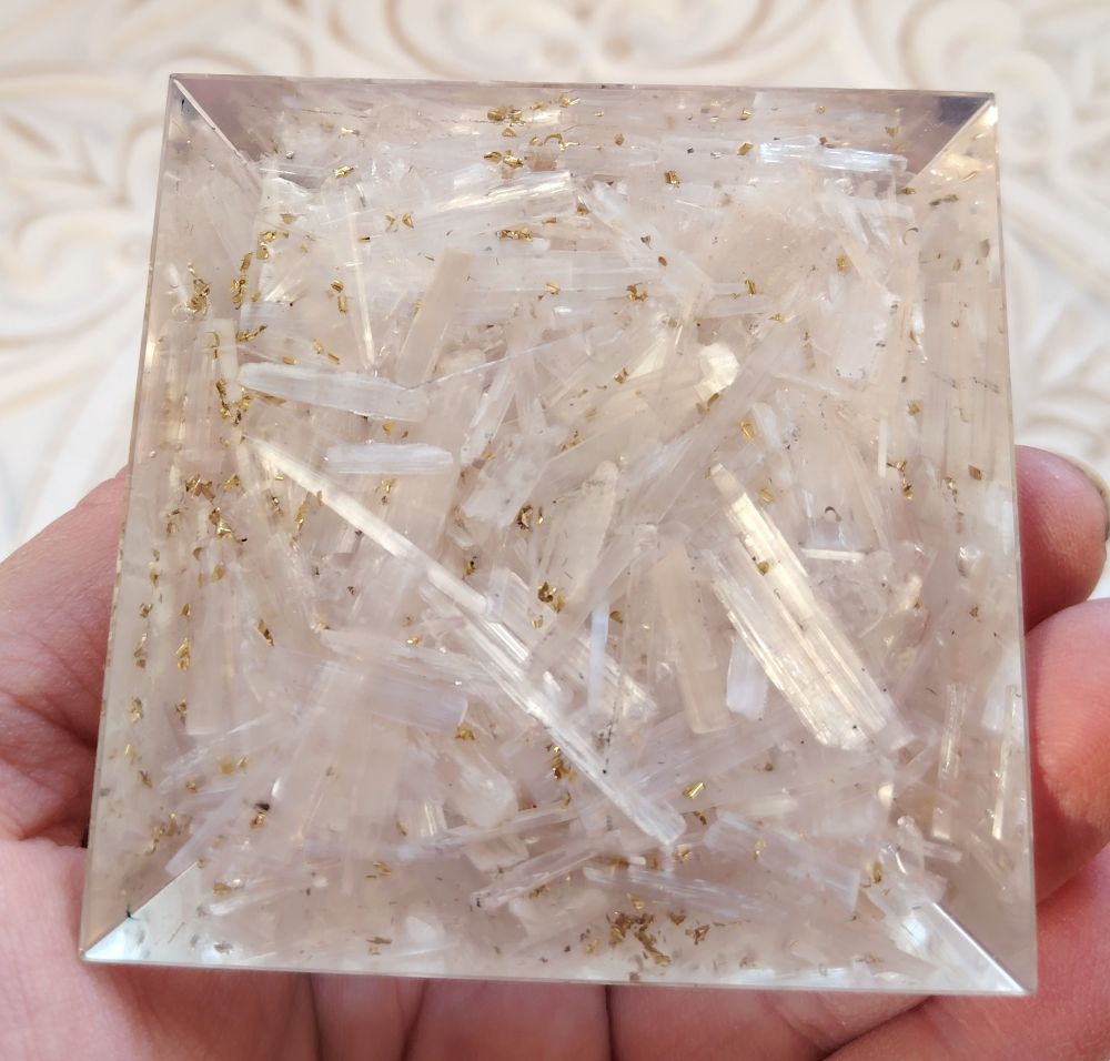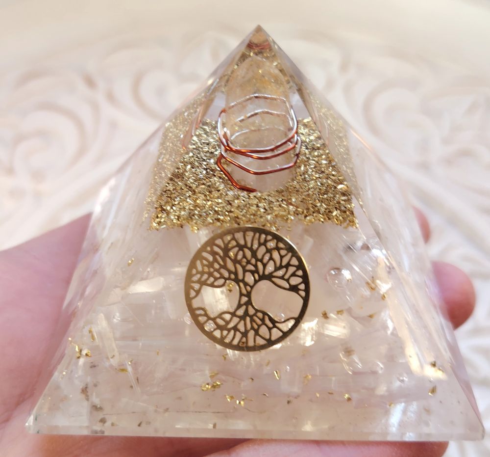 Kaunis orgoniitti, jossa orgaaninen ainesosa sisältää hartsia ja seleniittiä, ei-orgaaninen ainesosa metallia eli tässä pyramidissa on kuparihiukkasia ja kuparilankaa. Kärkenä kvartsikide. Pyramidissa on myös kullanvärinen elämänpuu symboli. Käytä tätä orgoniittipyramidia tuomaan sinulle tai ympäristöön (kotona/työpaikalla) enemmän valon energiaa ja sisäistä rauhaa. Seleniitti ja vuorikristalli yhdessä auttavat saamaan paremman yhteyden opastajiin ja auttajii. Käytä esim. tulkinnoissa, kanavointityössä, parannustyössä ym.