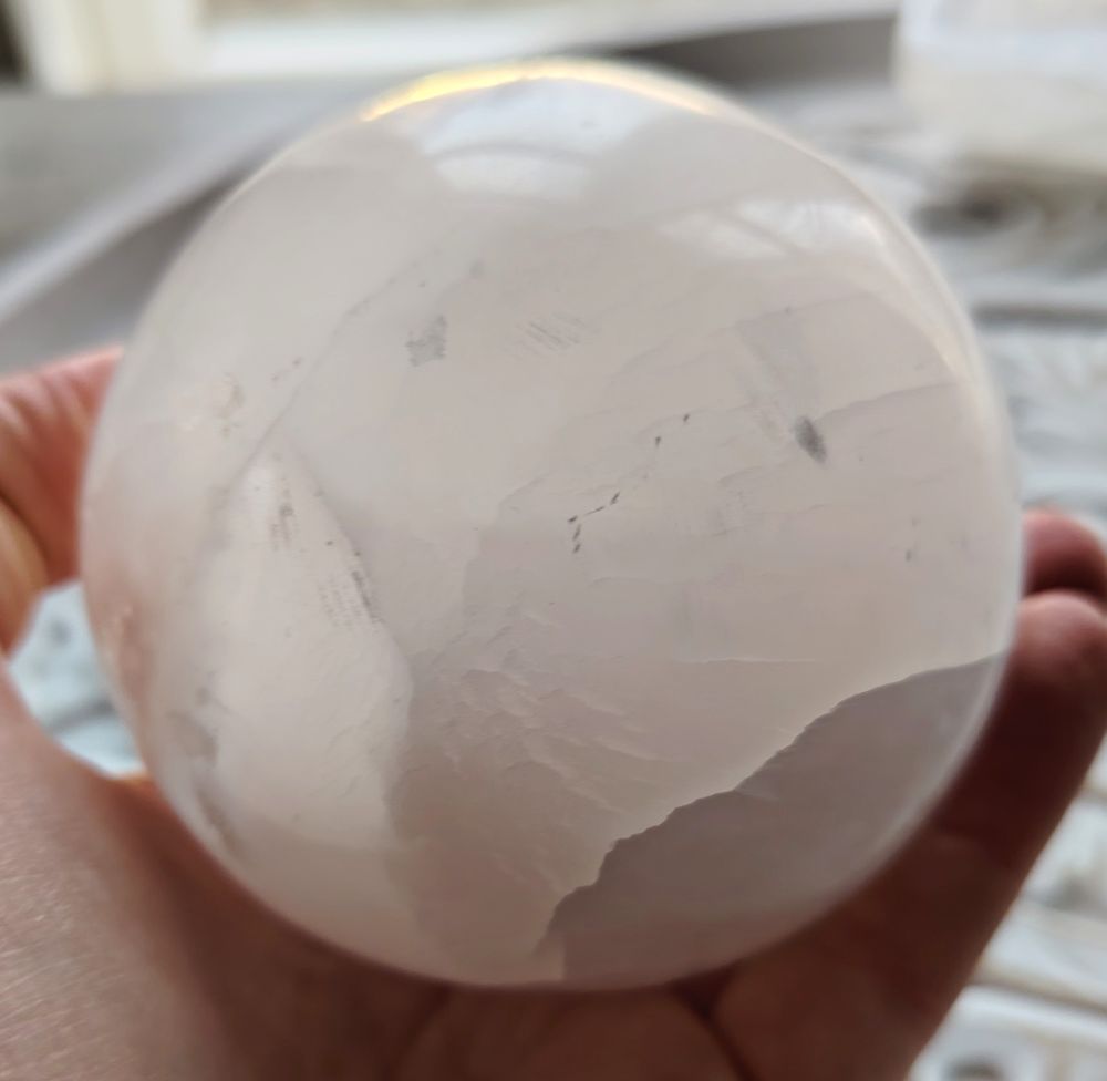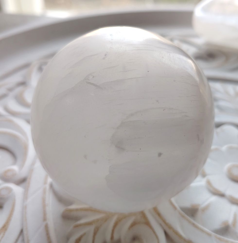 Tämän pallon halkaisija on n. 80 mm (+-). Marokkolaista seleniittiä. Saat itsellesi kuvassa näkyvän pallon!